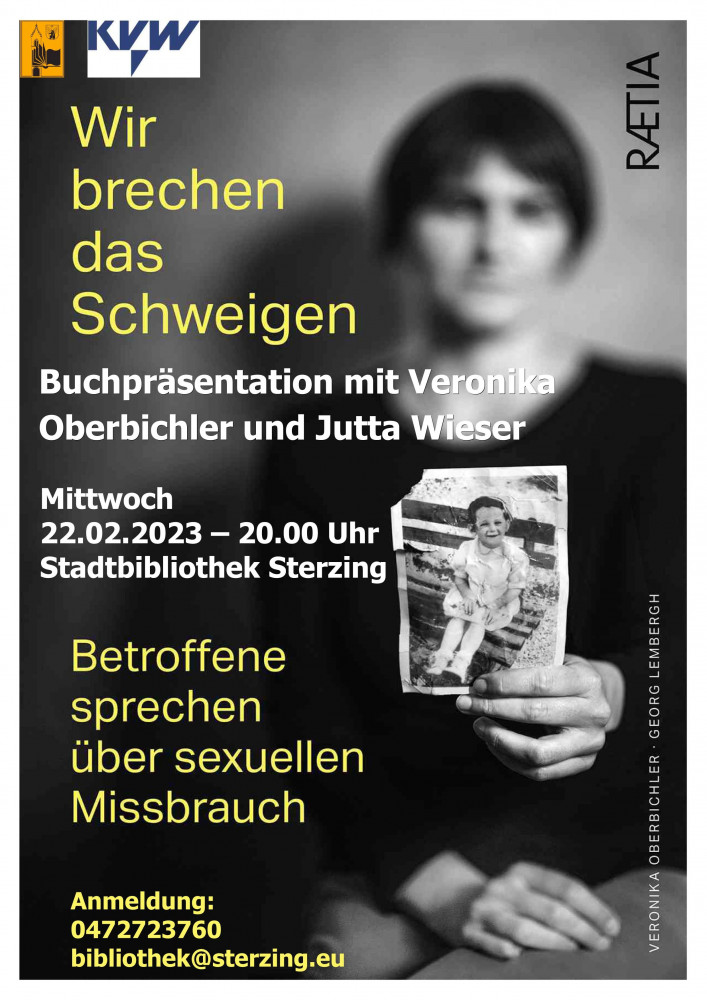 Veranstalter: Stadtbibliothek SterzingAm Mittwoch, den 22. Februar 2023, stellt die Autorin und Psychotherapeutin Veronika Oberbichler im Gespräch mit Bibliotheksdirektorin Karin Hochrainer ihr Buch „Wir brechen das Schweigen – Betroffene sprechen über sexuellen Missbrauch“ um 20 Uhr in der Sterzinger Stadtbibliothek vor. Auszüge aus den Interviews mit Betroffenen liest die Sprecherin und Redakteurin Jutta Wieser.