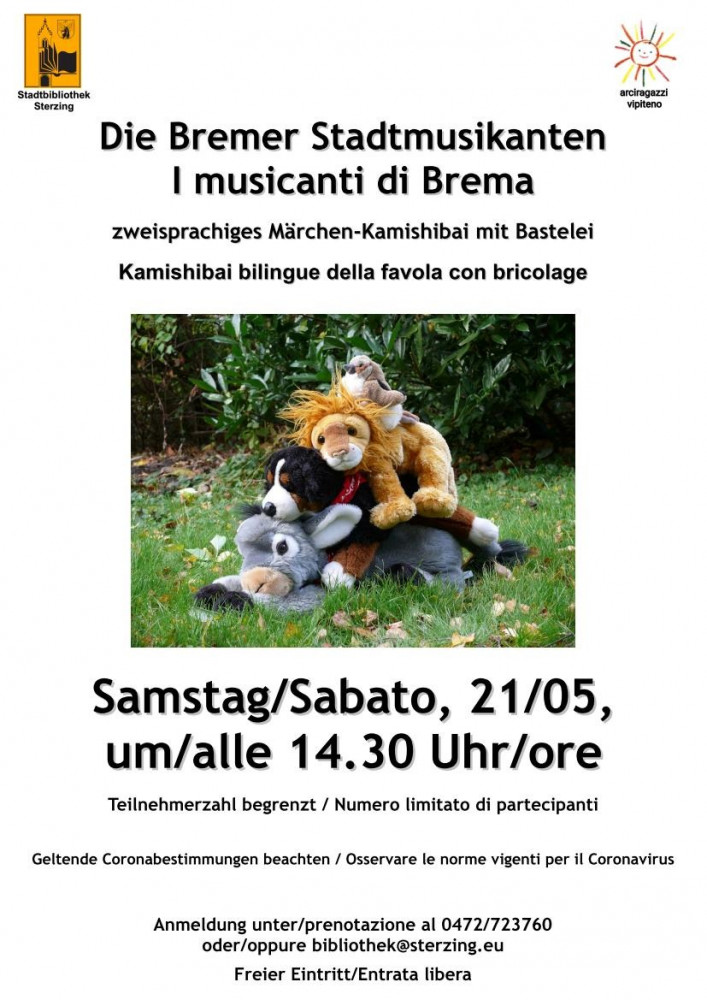 Am Samstag, den 21. Mai 2022, findet um 14.30 Uhr wieder der zweisprachige Märchentreff für Kinder von drei bis sechs Jahren in der Stadtbibliothek Sterzing statt. Die Vorleserinnen Maria Nunzia und Margit präsentieren im Mai das Grimm-Märchen „Die Bremer Stadtmusikanten“ und laden im Anschluss alle Kinder zu einer Bastelei ein. Da dies der letzte Märchentreff vor der Sommerpause sein wird, erwartet euch am Ende eine kleine Überraschung. Der nächste zweisprachige Märchentreff findet dann wieder im Oktober statt.