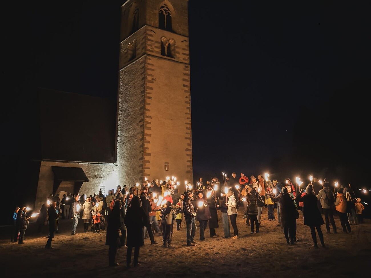 We then hike with torches from Peterbühl to Völs church square and immerse ourselves in the bright glow of the Christmas market, where atmospheric music awaits us.