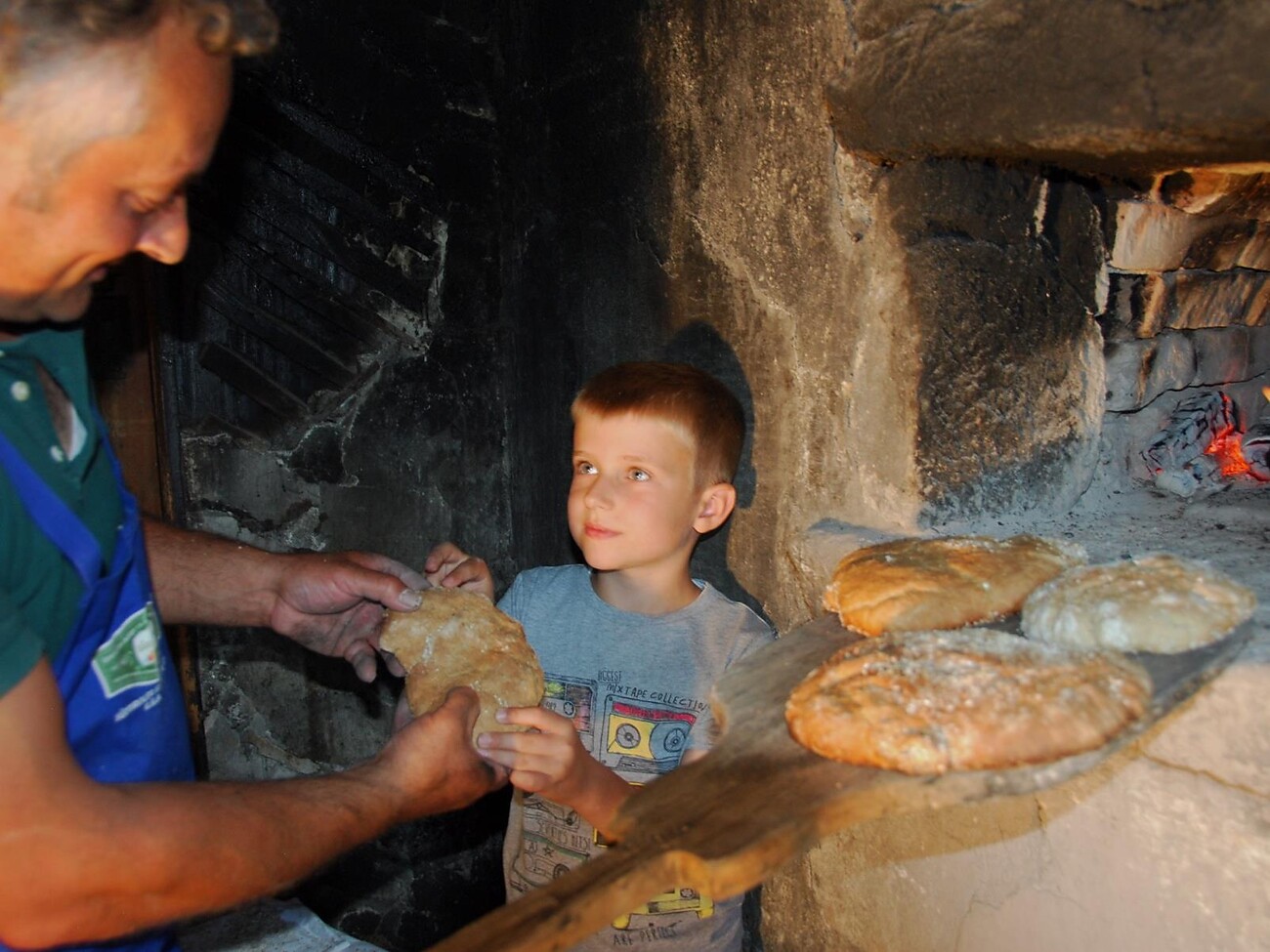 Baking together traditional bread in a wood-burning oven is fun and not difficult. The farmers demonstrate step by step how to mix all ingredients to form a dough.