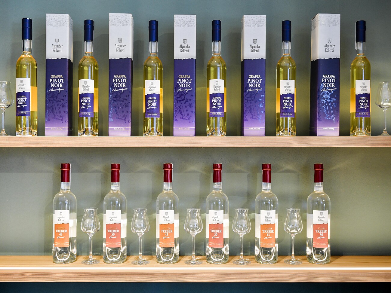 Die Destillate - wie Treber, Gewürztraminer, Chardonnay, Goldmuskateller und Pinot Noir – sind edel und harmonisch im Geschmack, mit dem Duft und der Intensität der heimischen Traubensorten aus und um der Stadt Meran. Ein reiner Genuss für Kenner und Liebhaber.