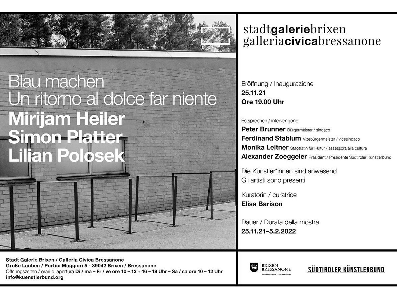 Liest sich der Titel wie eine Aufforderung, so wagt sich die Ausstellung Blau machen - Un ritorno al dolce far niente in einer globalisierten Konsum– und Erlebnisgesellschaft eine Auszeit vorzuschlagen. Mirijam Heiler, Simon Platter und Lilian Polosek zeigen hier von 25.11.21 bis 5.2.22 Arbeiten, welche sich mit dem abstrakten Thema der Zeit beschäftigen. Die Künstler*innen reflektieren absurde Konzepte wie Freizeit, Langeweile und die schier unvorstellbare Möglichkeit von simplem Sein im jetzigen Moment. Dabei versteht sich die Ausstellung nicht als Hinweis auf einen Fehler im eigenen Zeitmanagement oder als temporäre Pause um schlussendlich wieder der Produktion zu dienen. Vielmehr schafft sie eine alternative Perspektive, die zum Verweilen einlädt und in welcher die Grauen Herren keine Chance haben zu existieren.