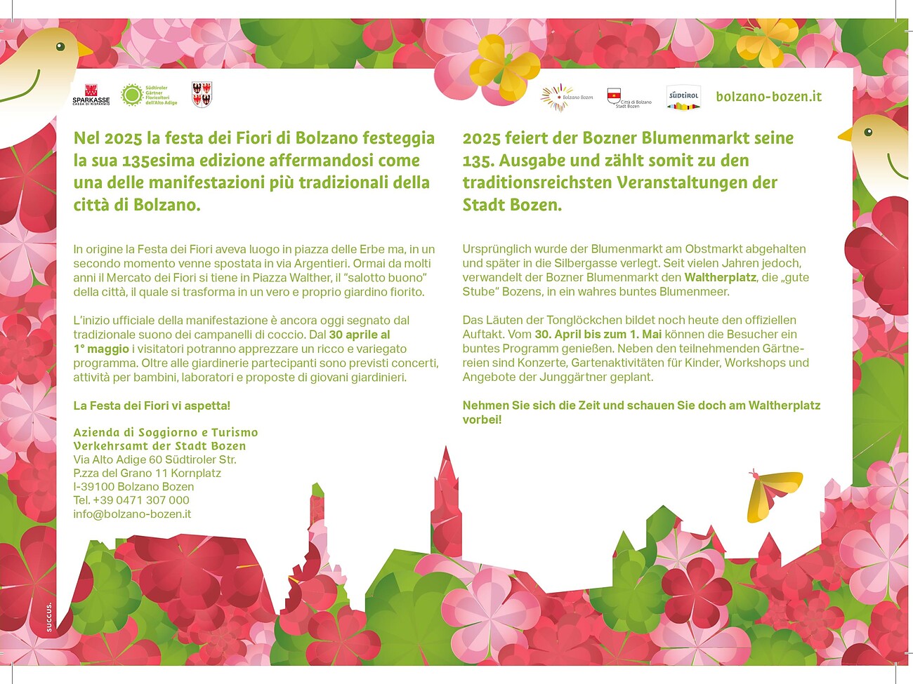 Bolzano in spring is filled with vibrant colors and enchanting scents as the traditional Flower Festival celebrates its 135th year. Walther Square will be adorned with countless flower arrangements and unique decorations, creating a truly magical atmosphere.