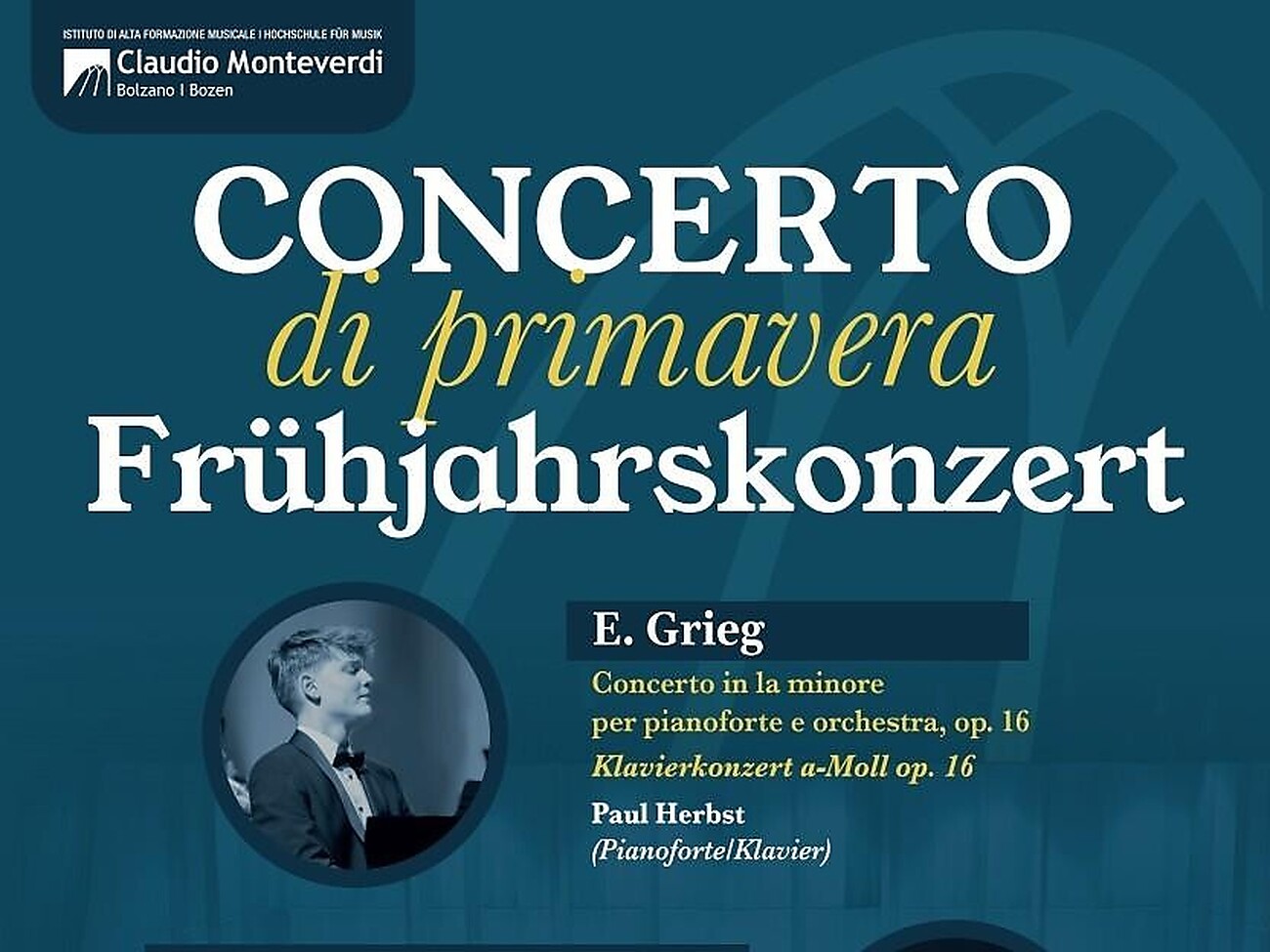 The Conservatory invites you to its traditional spring concert. The first part of the program features Edvard Grieg’s Piano Concerto in A minor, Op. 16, performed by the young pianist Paul Herbst, a student of Prof. Pulini and prizewinner of several national and international competitions.