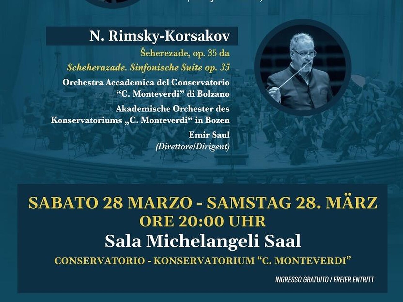 In the second part, the Conservatory Orchestra conducted by Emir Saul will perform the famous symphonic suite Scheherazade by Nikolai Rimsky-Korsakov.
