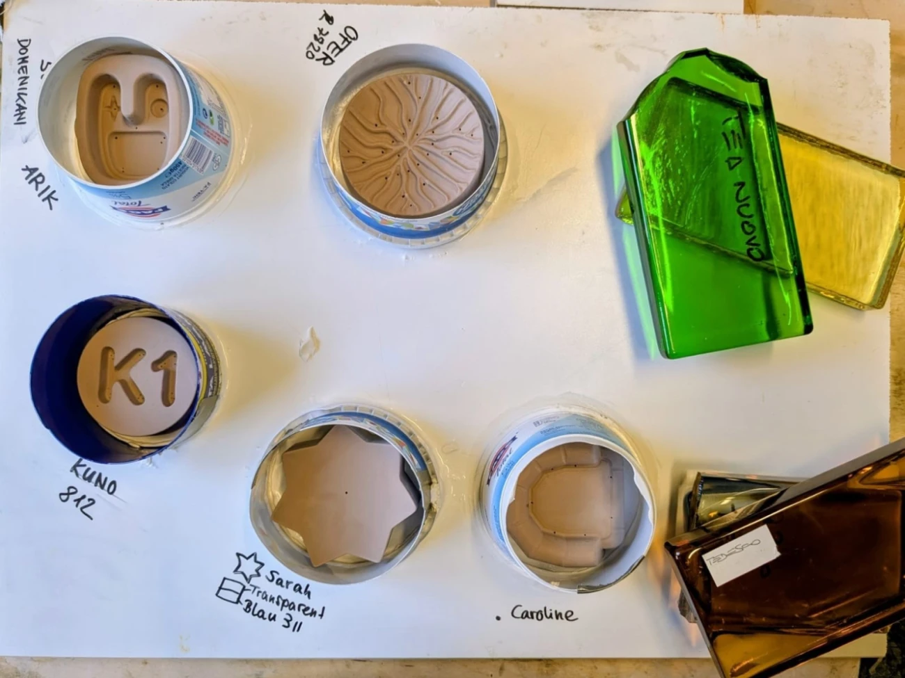 Dieses Designprojekt bot den Studierenden die Gelegenheit, zwei Techniken zu erproben: Tiefziehen zur Herstellung der Puddingformen aus einer Kunststoffplatte, sowie Pâte de verre, eine alte und feine Glaskunsttechnik zur Herstellung der gläsernen Budini. Nach einer anfänglichen Phase mit Handskizzen entwickelten die Studierenden die digitalen Zeichnungen für die CNC-Fräsung des ersten Positivmodells, das sie anschließend für das Tiefziehen der Kunststoffplatten verwendeten. Mit demselben Positivmodell durchliefen sie Schritt für Schritt die verschiedenen Phasen der Glasbearbeitung. Das Endergebnis? Budini, die man auch mit den Augen genießt.