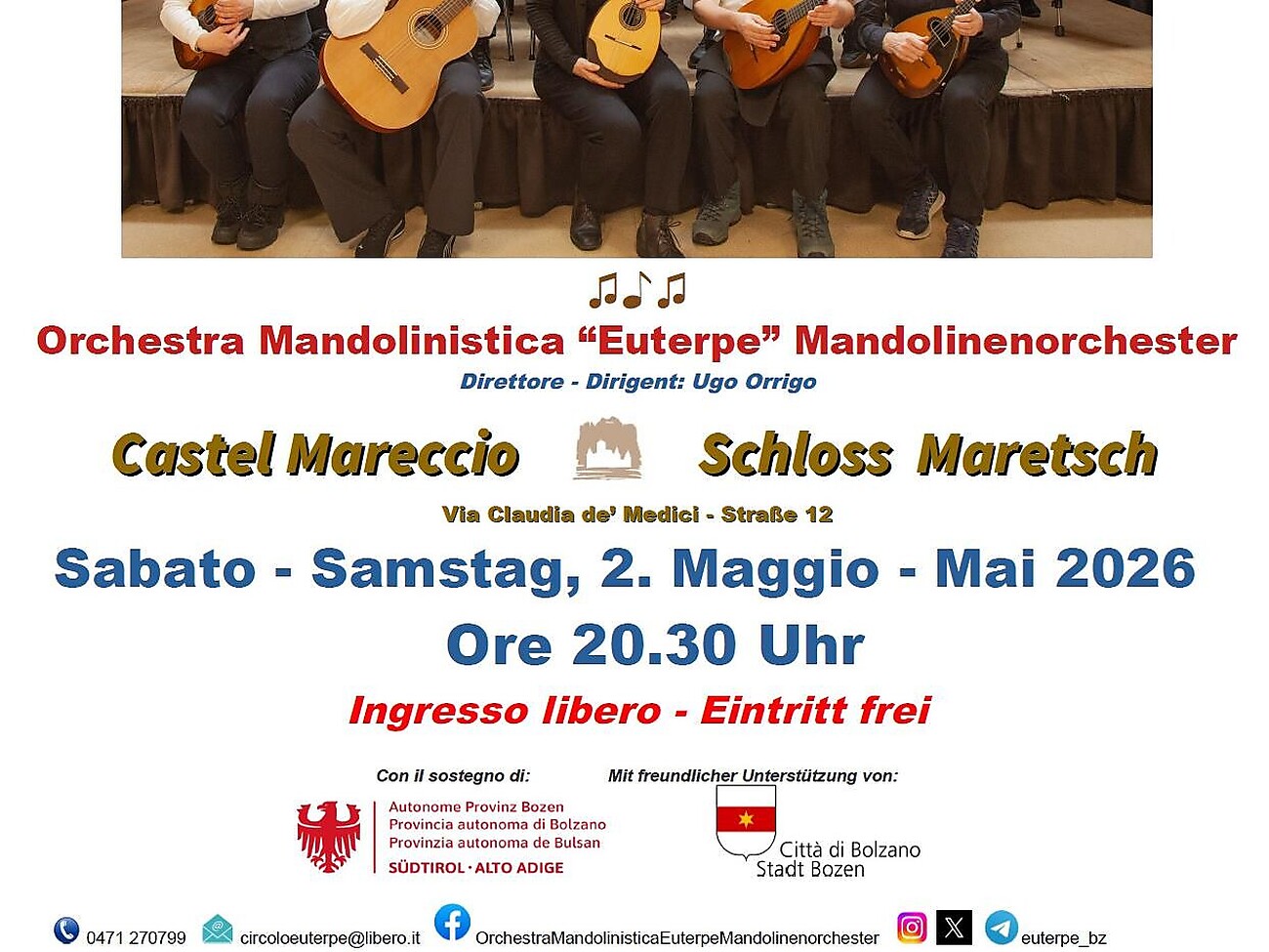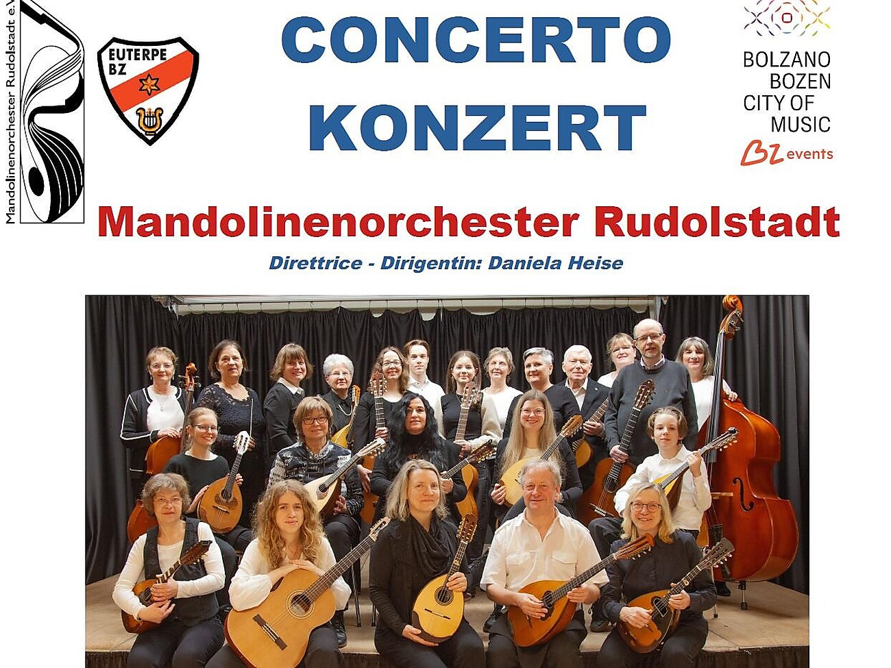 The Euterpe Mandolin Orchestra hosts the Rudolstadt Mandolin Orchestra for a program in several parts. The first half features the historic ensemble from Rudolstadt, founded in 1919 and conducted by Daniela Heise. This is followed by the Bolzano plucked string orchestra under the direction of Ugo Orrigo. The evening concludes with a joint performance by both orchestras.