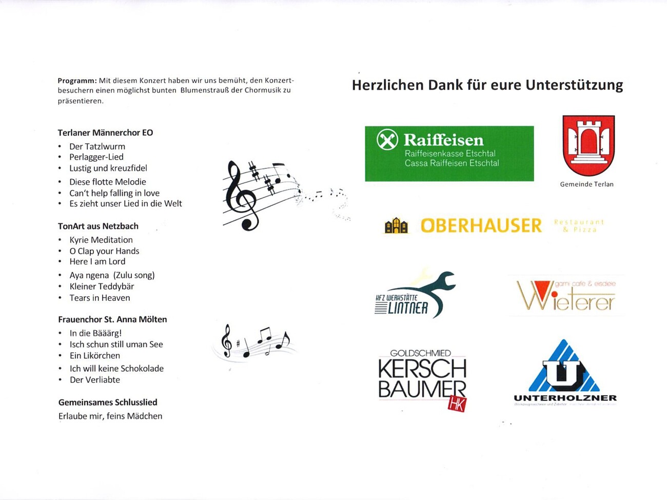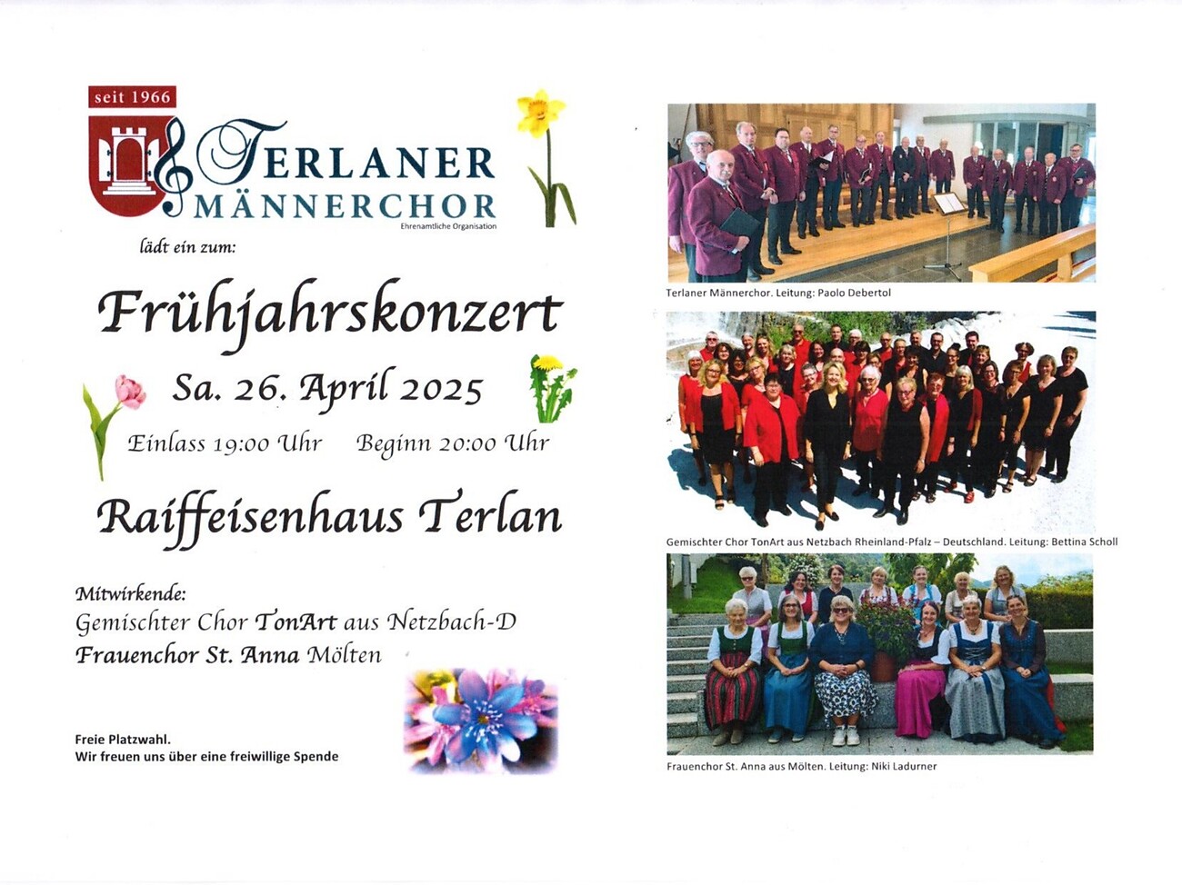 In order to offer our audience as colourful a bouquet of choral singing as possible, this time the mixed choir TonArt from Netzbach in Germany and the women's choir St. Anna from Mölten will be joining us. For our part, we have reactivated some songs from the origins of our male choir. We look forward to your participation in the concert.