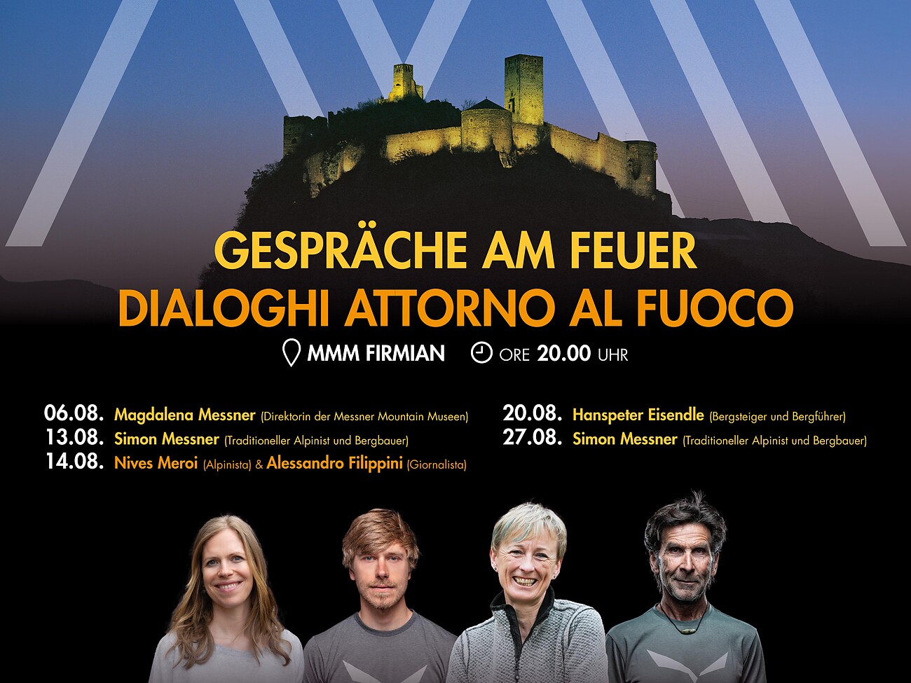 Tuesdays in August in German and Wednesday, 14 August in Italian: evening museum tour of the MMM Firmian. The in-house restaurant is open for you in the evening. As dusk falls (20:00), we will tell you about "mountaineering life" and answer your questions:
