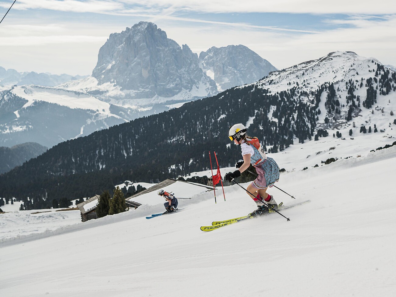 Val Gardena will celebrate Women’s Day on 08 March 2026 with a cheerful and colourful sporting event: the first women’s parallel slalom, where all participants will compete wearing a dirndl (traditional South Tyrolean dress). The race will take place on the Alpe di Siusi near the Sanon Hut. Meeting point for the first edition of the Dolomites Dirndl Ski Day is at 10:00 a.m. at the Sanon Hut, where an aperitif with snacks will be offered. The race itself – an easy parallel slalom with a dice game at the finish area – will start at 11:00 a.m. Before and during the race there will be musical entertainment with DJ Simon & Ina Pross. The prize-giving ceremony will take place at 2:30 p.m. Participation is open exclusively to women in pairs (friends, sisters, mother/daughter, etc.) aged 18 to 99.