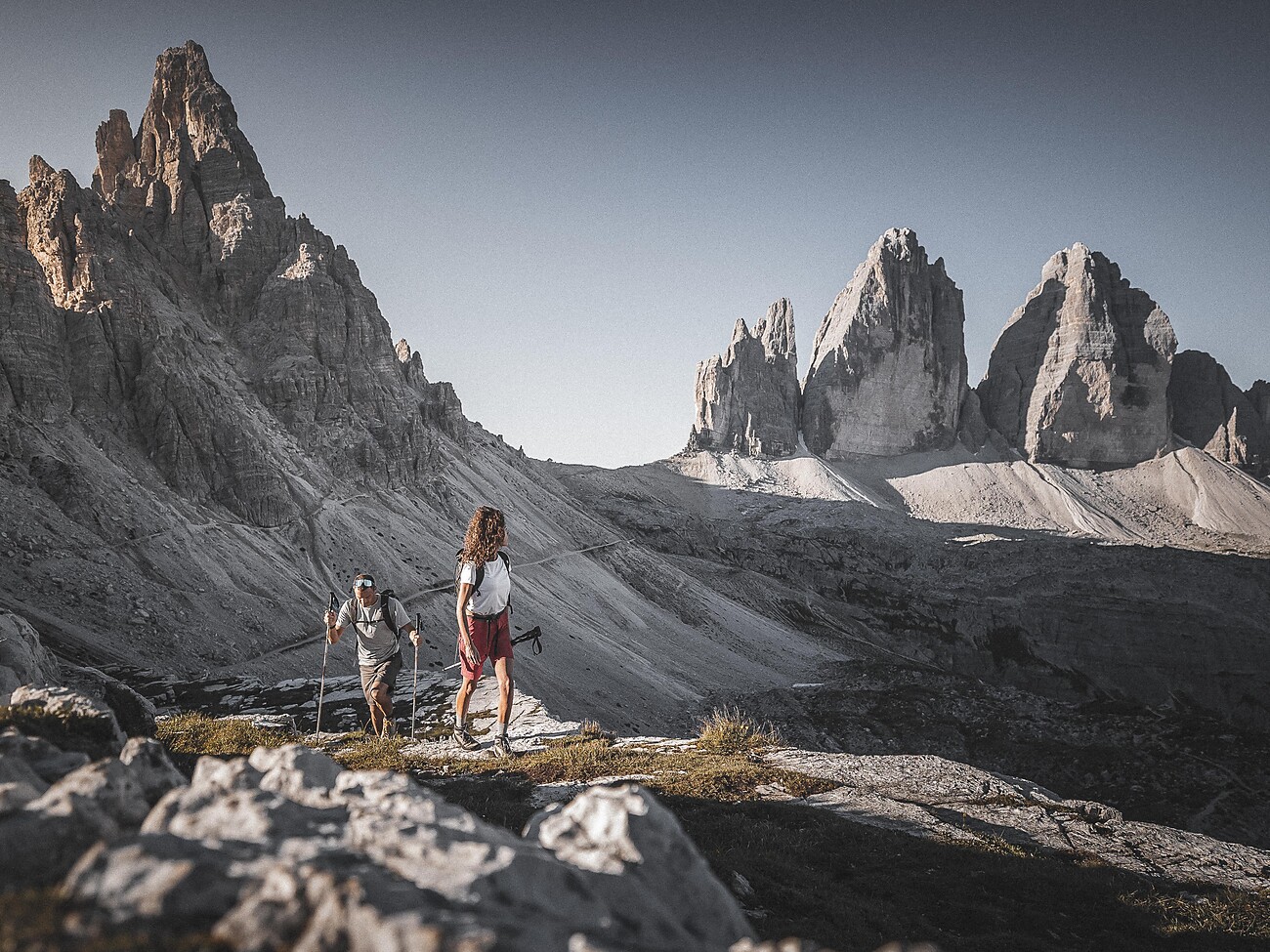 We start with the shuttle in the Braies Valley and drive to the Auronzohütte hut (2330m). After a 50 minutes hike we reach the Paternsattel. The hike continues around the 3 Peaks to the Langalm hut. After a break we hike back to the starting point.