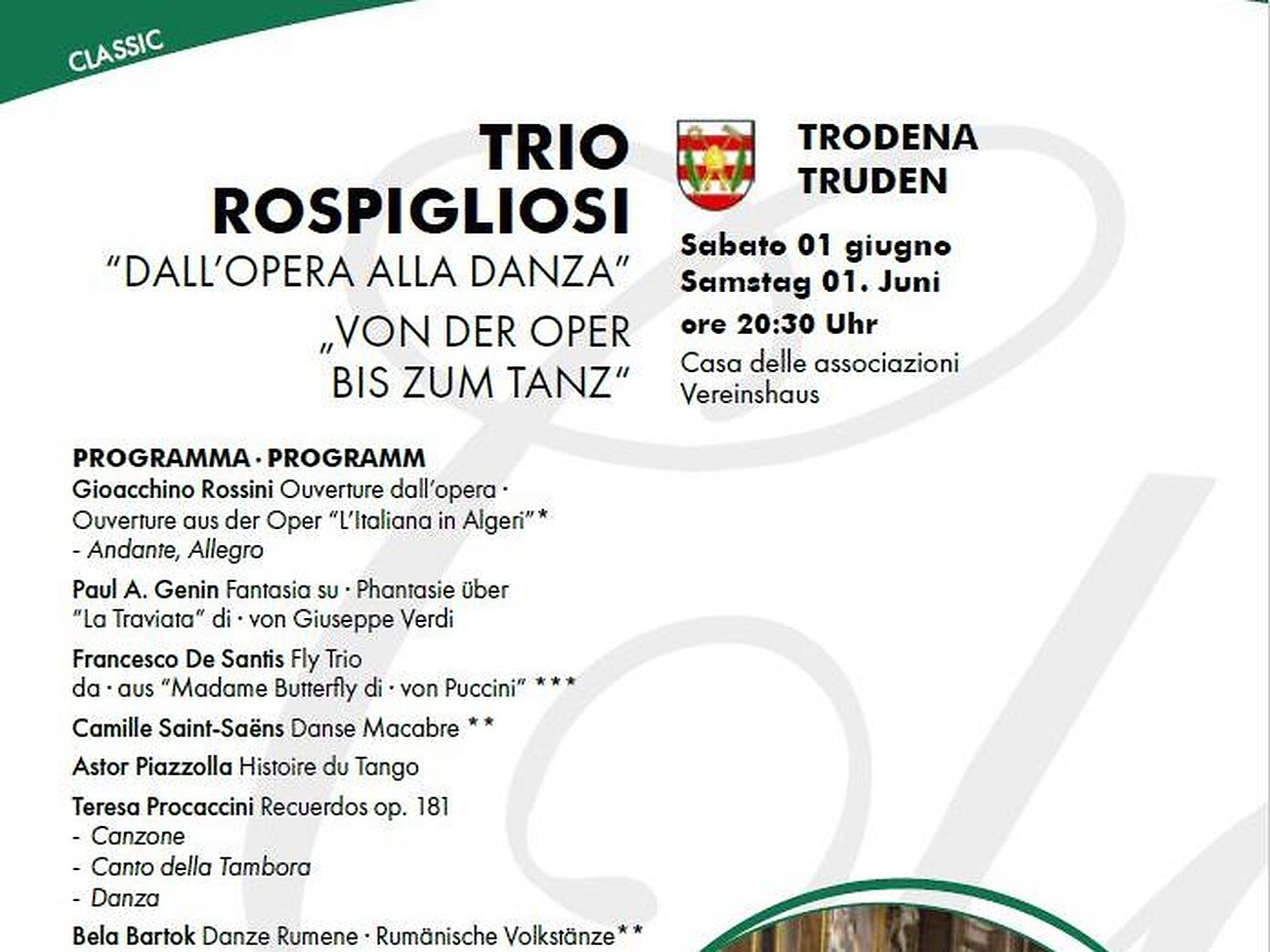 Alle sind herzlich eingeladen zum Konzert des "Trio Rospigliosi" im Vereinshaus Truden. Organisiert vom Bildungsausschuss in Zusammenarbeit mit der Gemeinde Truden.