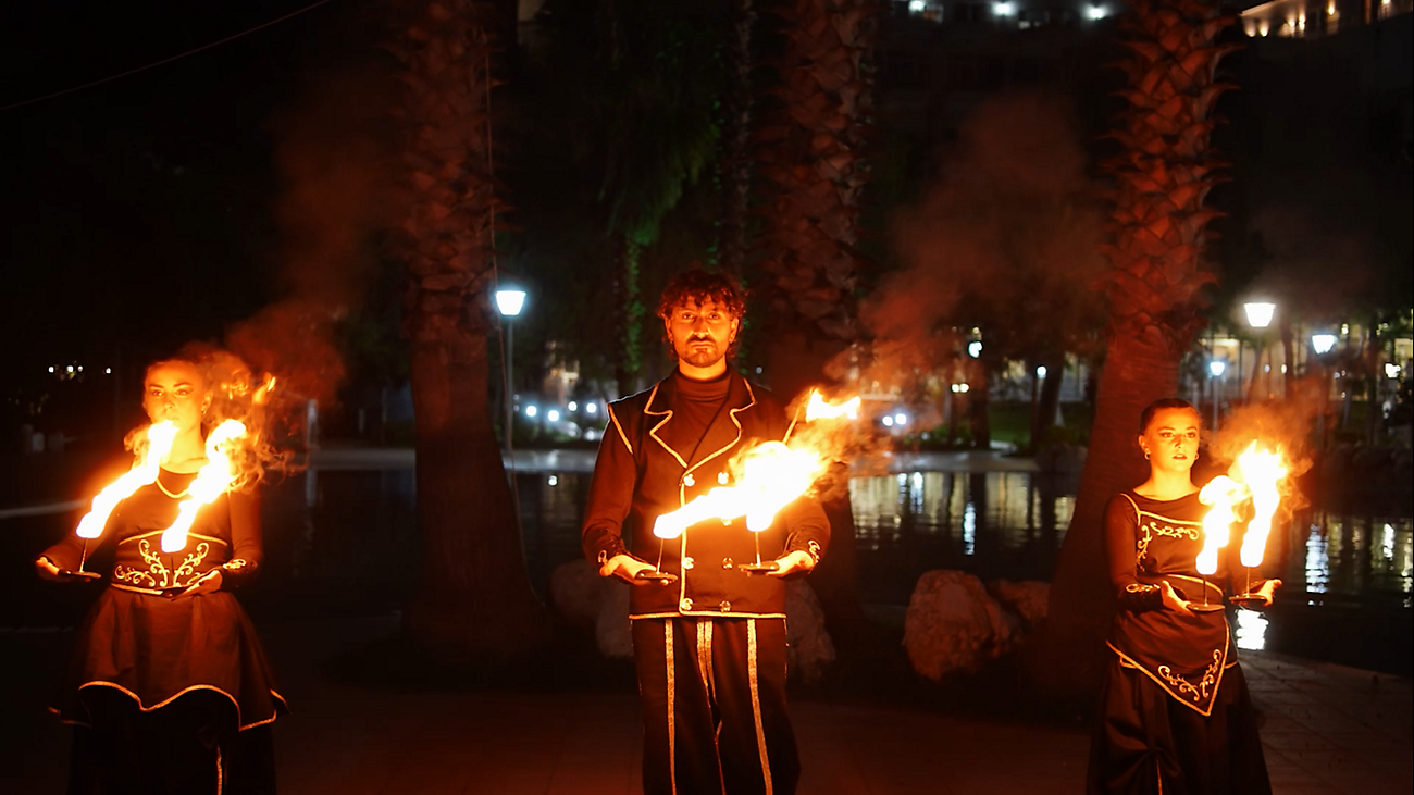 With ELEMENTRIS, darkness becomes a stage: three fire artists bring light, warmth, and energy to the darker season. Accompanied by powerful music, they create a 20 - 25-minute fire show featuring fire fans, flaming hula hoops, and many other captivating elements. A visual poem of flames, movement, and atmosphere that mesmerizes the audience.