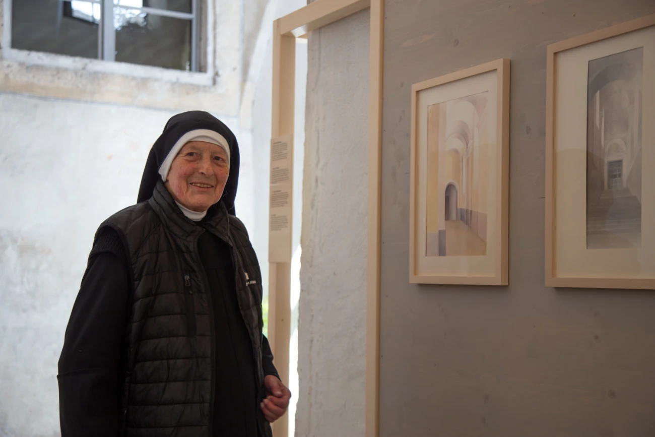 Im Fokus stehen zeichnerische Arbeiten aus drei Schaffensperioden im Spannungsfeld zwischen Klosterleben und Kunstschaffen. Erstmals werden Zeichnungen aus ihren Studienjahren an der Kunstgewerbeschule Zürich und der Kunstakademie André Lhote in Paris gezeigt, ebenso wie Entwürfe für Trachtenstickereien und die beliebten „Willi-Karten“ mit Motiven aus dem Klosterleben.