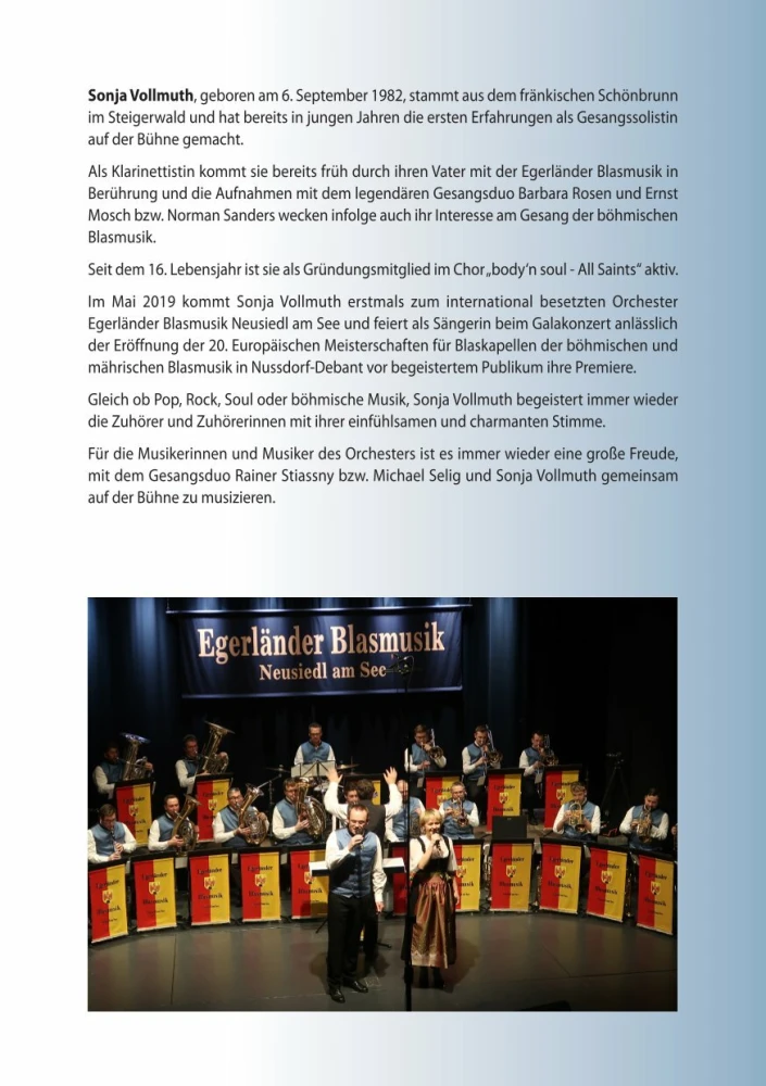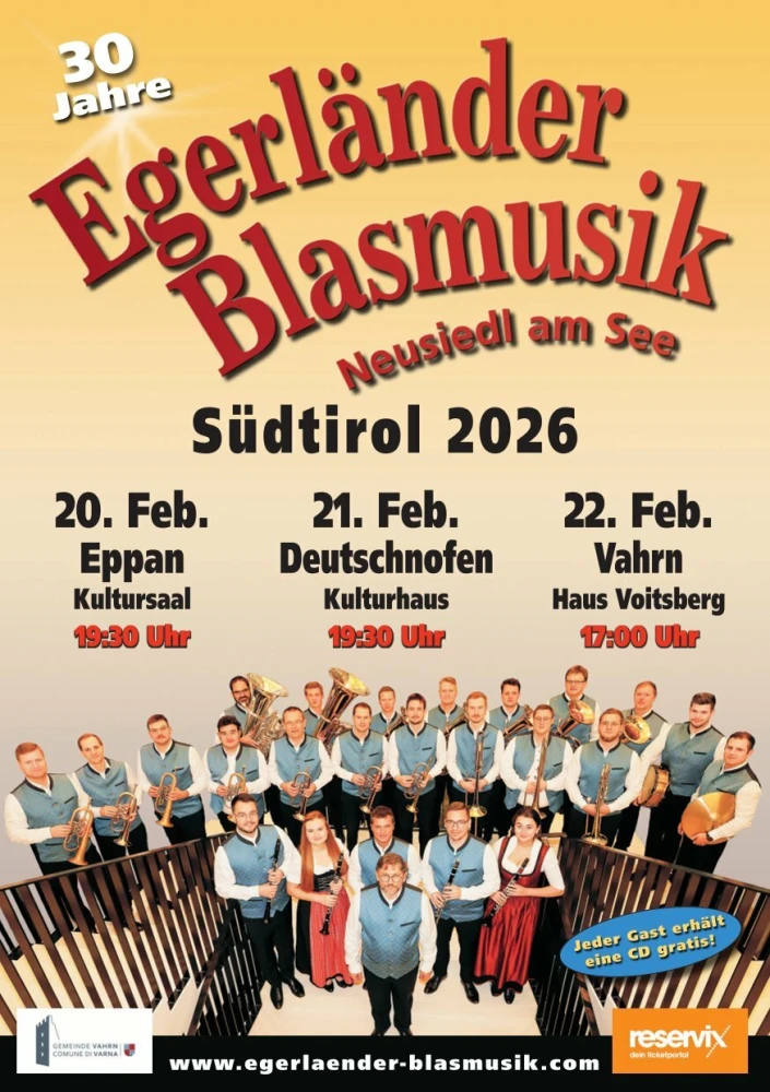 Mit dem neuen Programm „Böhmischer Traum“ kommt das international besetzte Blasorchester „Egerländer Blasmusik Neusiedl am See“ am 22. Februar 2026 zum neunten Mal ins Haus Voitsberg nach Vahrn und verspricht dem Publikum Blasmusik auf höchstem Niveau.