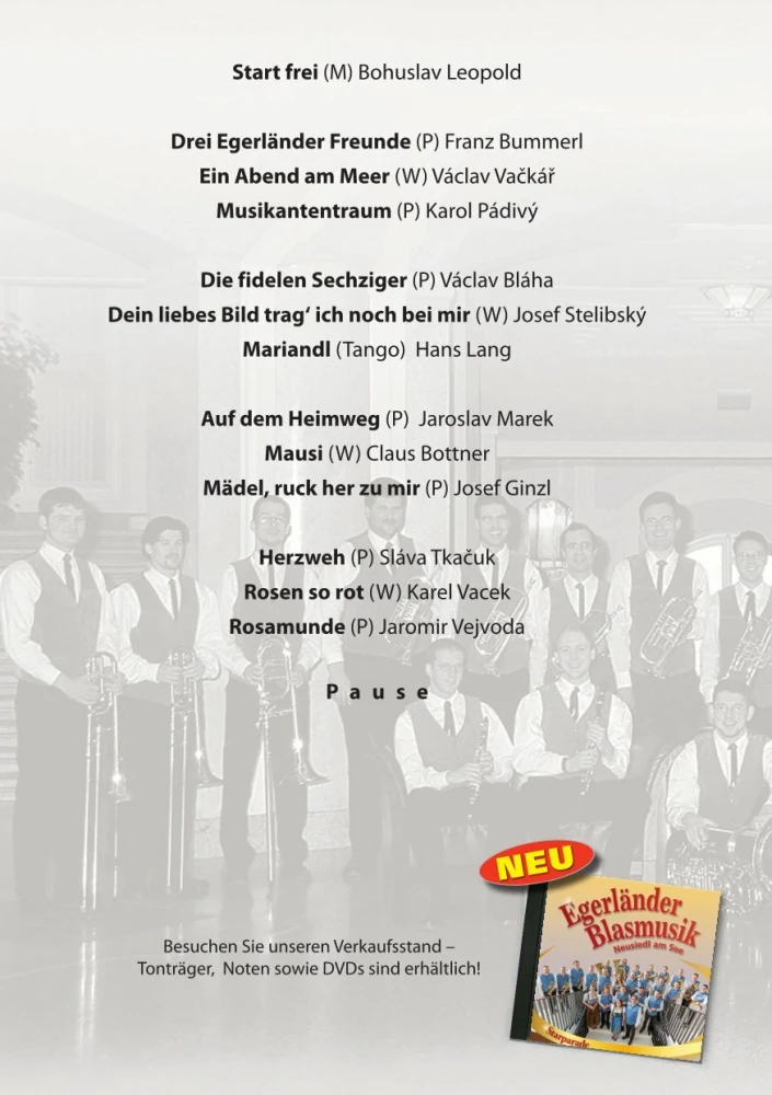Die Formation spielt in der typischen Besetzung, die jenes Klangerlebnis ausmacht, das durch Ernst Mosch und seine Original Egerländer Musikanten so bekannt geworden ist. Mit der Stilistik der 60-er und 70-er Jahre und der ureigenen Seele der Egerländer Blasmusik begeisterte dieses Ensemble in seinen Konzerten bisher zahlreiche Zuhörer in Österreich, Deutschland, Südtirol, der Schweiz, Tschechien und Holland.