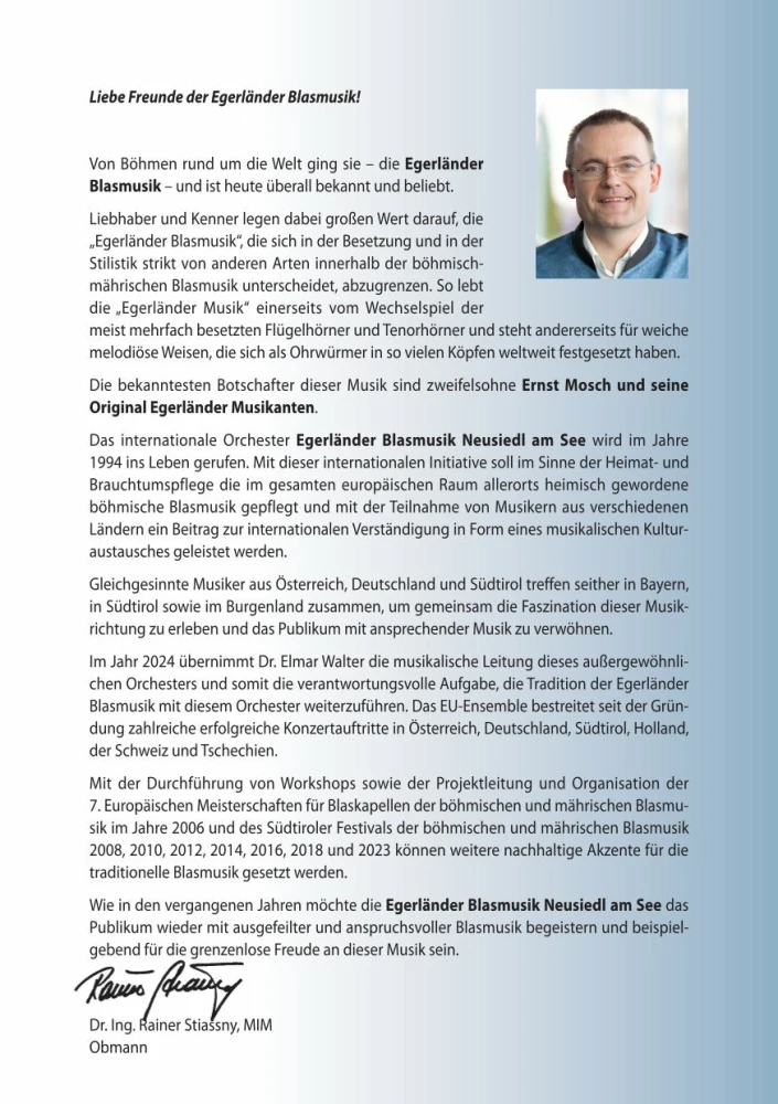 Idealismus und Gemeinschaftsdenken haben das Vorhaben der „Egerländer Blasmusik Neusiedl am See“ bisher getragen und werden dies auch künftig tun. In diesem Sinne freuen wir uns darauf, jedes Jahr neue Egerländer-Freunde kennenzulernen und hoffen, dass auch Sie bald dazugehören.Im Konzertprogramm der Egerländer Blasmusik Neusiedl am See finden sich viele bekannte böhmische Melodien, die als Egerländer Erfolge um die Welt gingen, zum Beispiel der Marsch „Astronautenmarsch“ oder der Walzer „Rauschende Birken“. Zudem wird das Orchester seine Vielfältigkeit und Perfektion durch Ausflüge in andere Musikrichtungen unter Beweis stellen. Evergreens wie „Moonlight Serenade“, „A Son of Preacherman“ oder auch verschiedene Solostücke standen bereits auf dem Programm und haben immer wieder aufs Neue das anspruchsvolle Publikum begeistert.