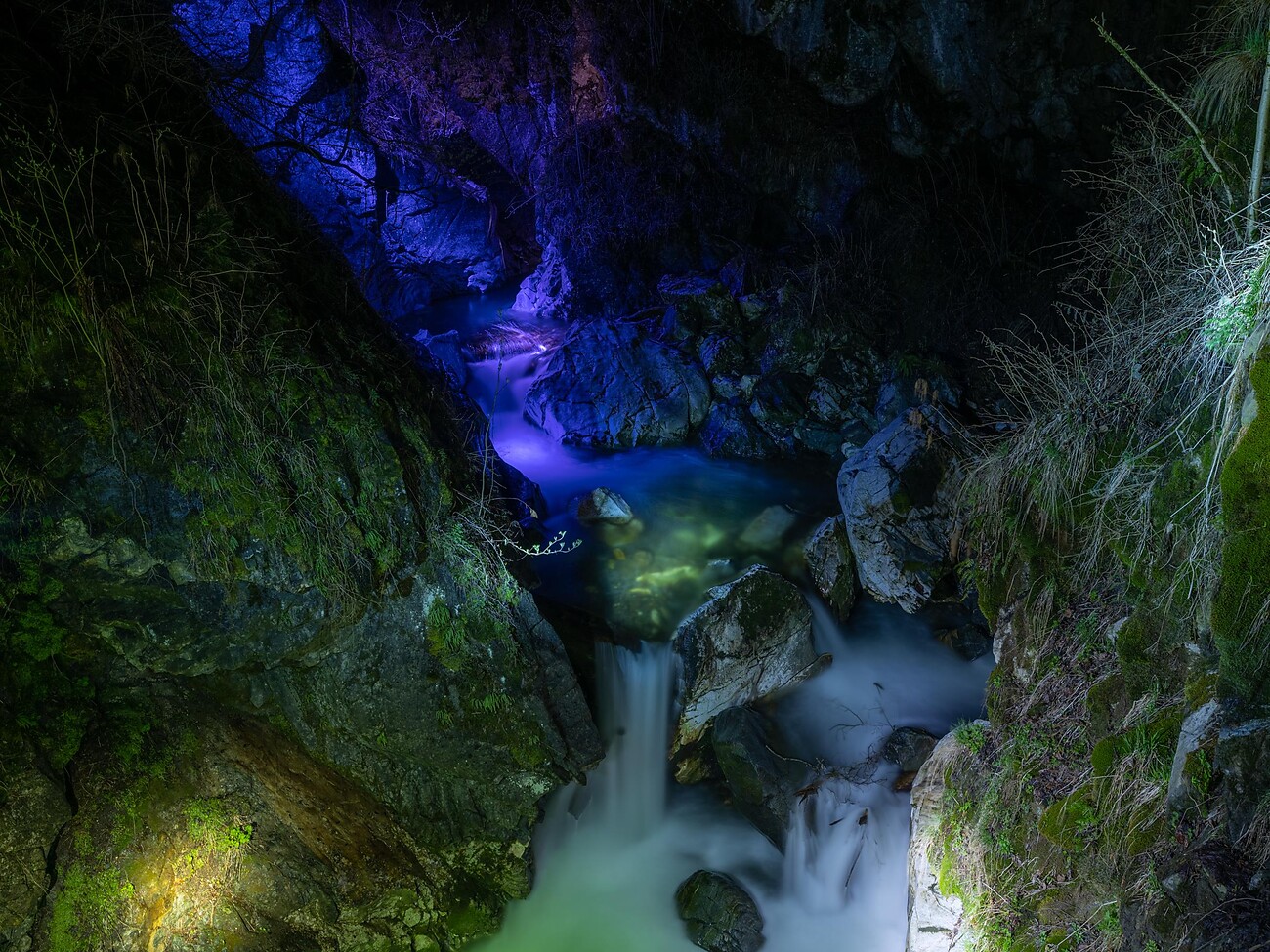 Gentle lights bathe the rushing water in mysterious colors, bringing the gorge to life at night.