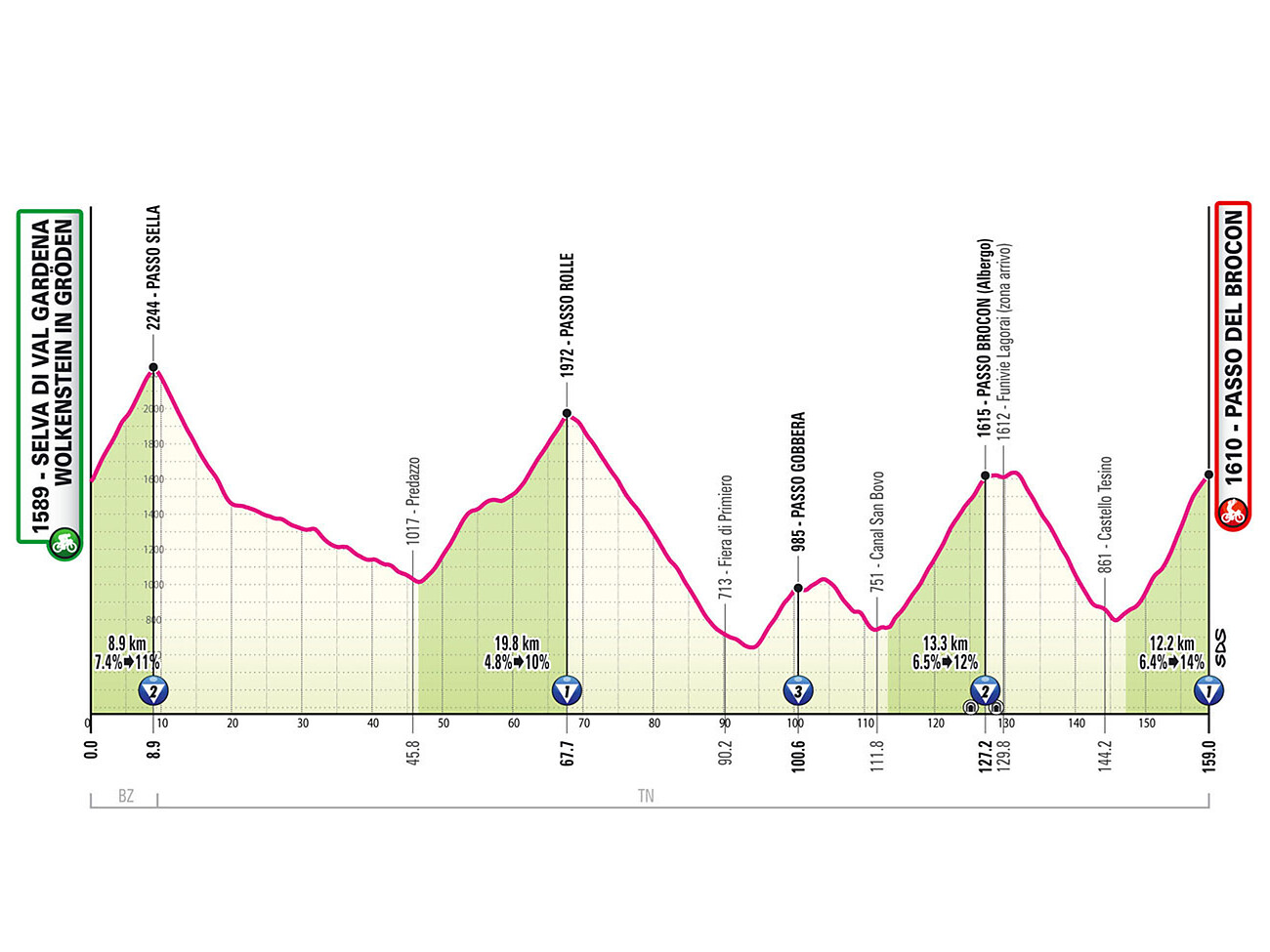 The stage is short and very challenging, with few kilometers and significant elevation gain. It begins with the ascent of the Sella Pass, and after the Val di Fassa (the only "calm" section), the cyclists will sequentially climb the Passo Rolle, Passo Gobbera, and Passo Brocon until the first checkpoint. The descent to Castello Tesino prepares the terrain for the subsequent ascent from the steepest and uncharted side of Val Malene to Passo Brocon, where the finish line awaits. The last 2 kilometers are very steep, with tight and consecutive hairpin turns, with an average gradient of 12%.