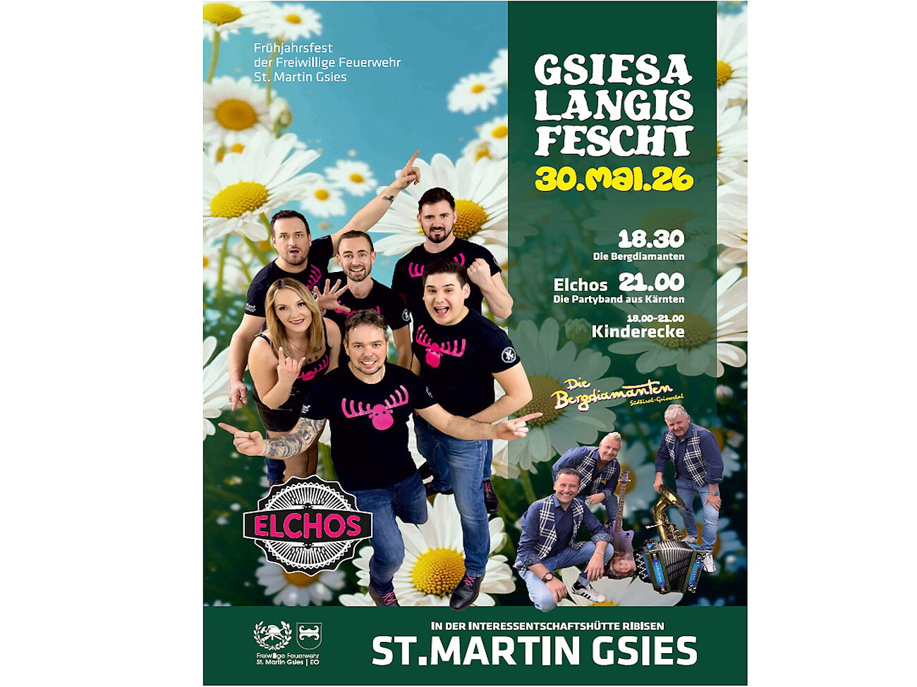 A spring festival of the Volunteer Fire Brigade of St. Martin full of music and entertainment. Programme: from 6:00 pm to 9:00 pm children’s area for younger guests. From 6:30 pm musical entertainment with "Die Bergdiamanten" from the Gsiesertal Valley (schlager, folk music and cover band). From 9:00 pm the party band Elchos from Carinthia provides fun, great vibes and lively atmosphere. Food and drinks are well provided.