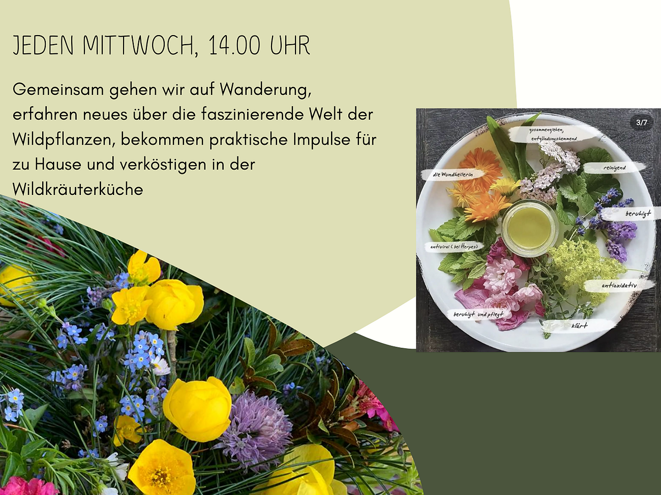 Together we go on a hike with herbalist Maria, learn new things about the fascinating world of wild plants, get practical ideas for at home and taste them in the wild herb kitchen