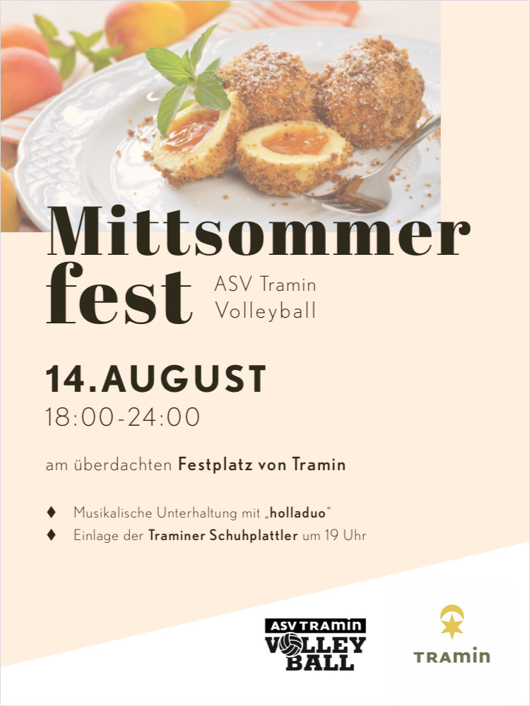 Der ASV Tramin Volleyball lädt herzlich zum Mittsommerfest ein, das am Sonntag, 14. August 2022 am überdachten Festplatz von Tramin stattfindet.