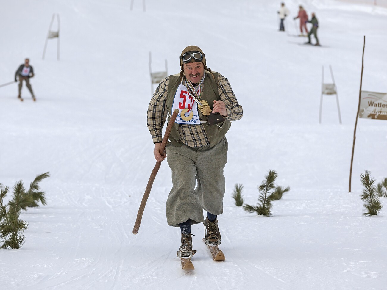 In March, when winter is loudly driven out every year in the tradition-conscious Upper Vinschgau Valley and the entire region is already being spoiled by the sun again, friends of traditional skiing meet at the Watles adventure mountain for a very special event. On this day, fans of authentic skiing fun take to the slopes in suits and ski outfits from the era of Luis Trenker, such as Norwegian dresses or Sarner jackets and hats, with the women wearing skirts and classic wooden walking sticks. They ski down the slopes on original wooden skis. And at the exuberant celebration afterwards, with regional specialities (food like in the old days), there is a waltz in the ski hut instead of après-ski.