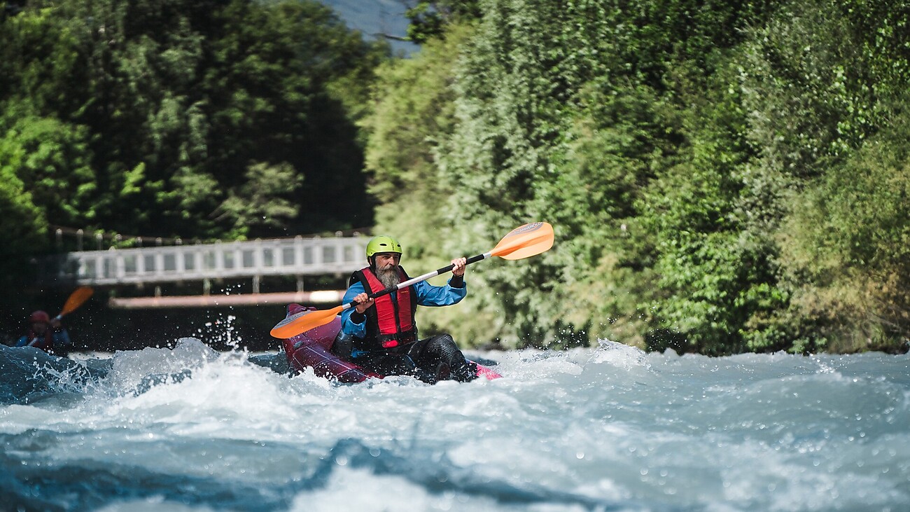 Accompanied by one of our qualified guides, the tour begins at our rafting base in Rabland/Rablà, where the equipment is handed out. With bag and baggage we go to Ciardes/Tschars. Arriving at the boat entrance, we unpack our packrafts (inflatable kayaks) and pump them up. As soon as all the kayaks are ready, there is an introduction to the paddling technique and a detailed safety briefing. Shortly after, we're off into some extraordinary, splashing water fun.