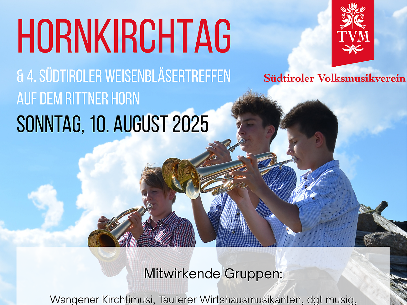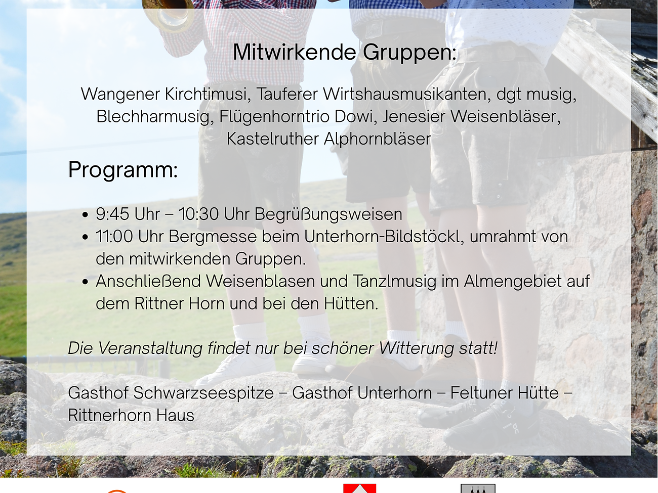 Traditional festival & Church Day on the Rittner Horn with an open air Mass at 11 a.m. at the Gasthof Unterhornhaus, followed by festivities with brass music at all the huts on the Rittner Horn. The event only takes place in good weather!