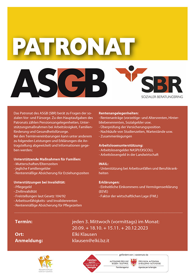 Das Patronat des ASGB (SBR) berät zu Fragen der sozialen Vor- und Fürsorge. Zu den Hauptaufgaben des Patronats zählen Pensionsangelegenheiten, Unterstützungsmaßnahmen bei Arbeitslosigkeit, Familienförderung und Gesundheitsfürsorge.