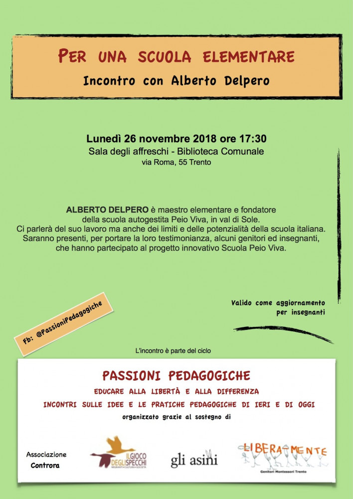 Alberto Delpero, maestro elementare e fondatore della scuola autogestita Peio Viva, parlerà del suo lavoro ma anche dei limiti e delle potenzialità della scuola italiana. In collaborazione con Associazione Controra, Liberamente, Gli Asini