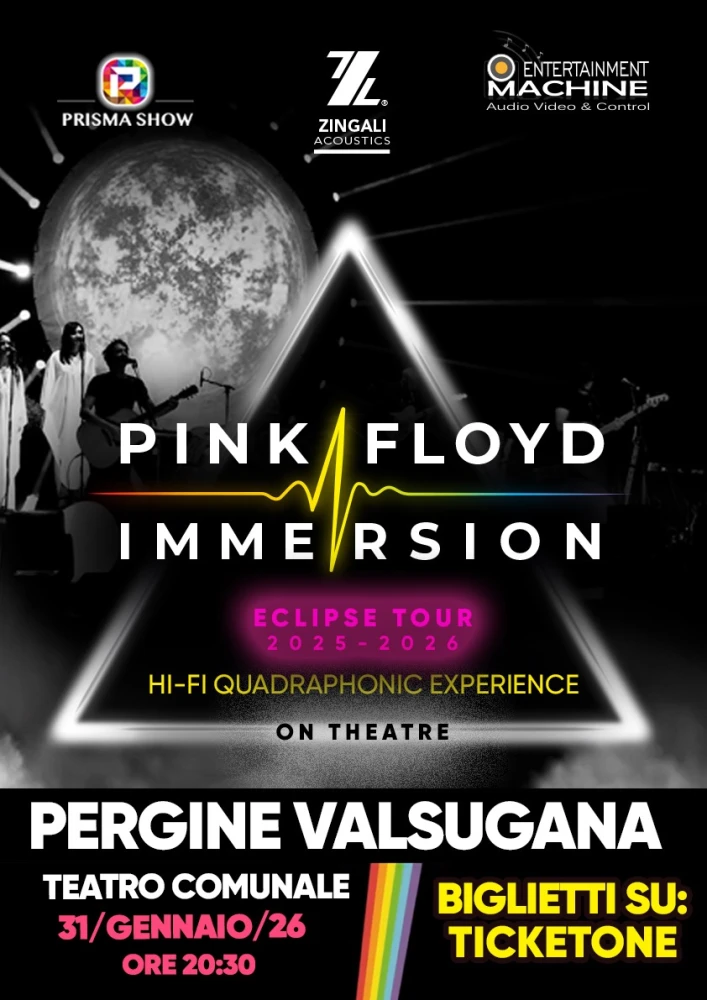 On January 31, 2026 at 8:30 PM, the Pergine Municipal Theatre will host a truly extraordinary event: the Pink Floyd Immersion – Eclipse Tour. After thrilling thousands of spectators across Italy, this unique production arrives in Trentino to deliver an experience that goes far beyond a simple concert. On stage, the atmosphere of the legendary Pink Floyd shows will come alive with the iconic circular screen, hypnotic lasers, breathtaking light shows, and the world’s only high-fidelity quadraphonic sound system, designed to wrap every listener in waves of emotion. The performance takes audiences through the timeless tracks of The Dark Side of the Moon and other masterpieces, recreating the intensity, magic, and depth of the original Pink Floyd concerts. This is not just music, but a complete sensory journey that touches the soul—an unforgettable night for lifelong fans and new generations alike, eager to feel the power of a legend reborn.