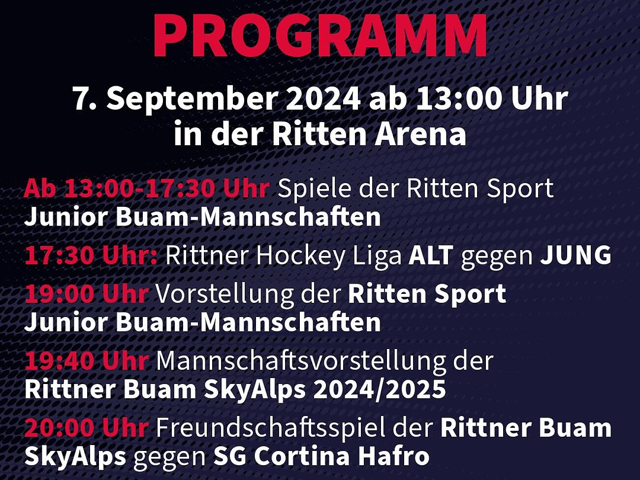 Many exciting games by the Ritten Sport Juniorbuam, as well as a prestigious game of the Rittner Hockey League (RHL). Team presentation of the Ritten Sport Juniorbuam and the AHL team of the Rittner Buam 2024/2025. Highlight: Friendly match against the runners-up SG Cortina Hafro. Food & Drinks from the Bar/Restaurant Arena with its reopening at the Rittner Hockey Day.