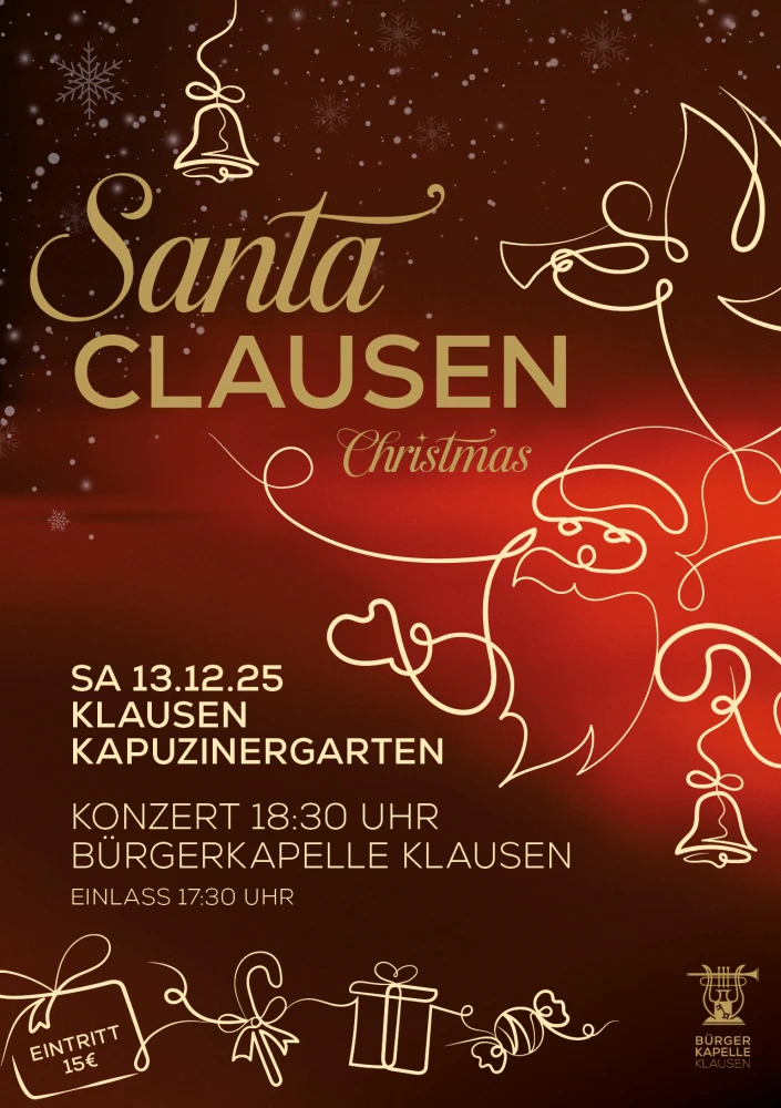 Am 13. Dezember um 18:30 Uhr lädt die Bürgerkapelle Klausen zu einem stimmungsvollen Konzert in den Kapuzinergarten Klausen ein. Freu dich auf festliche Klänge, weihnachtliche Stimmung und besinnliche Momente im Herzen von Klausen.