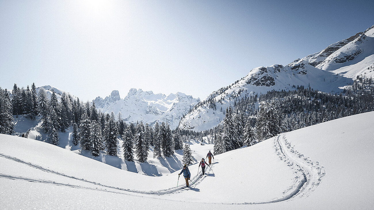 Ski tour at the Plätzwiese high plateau in the Pragser Tal Valley - DOLOMITES