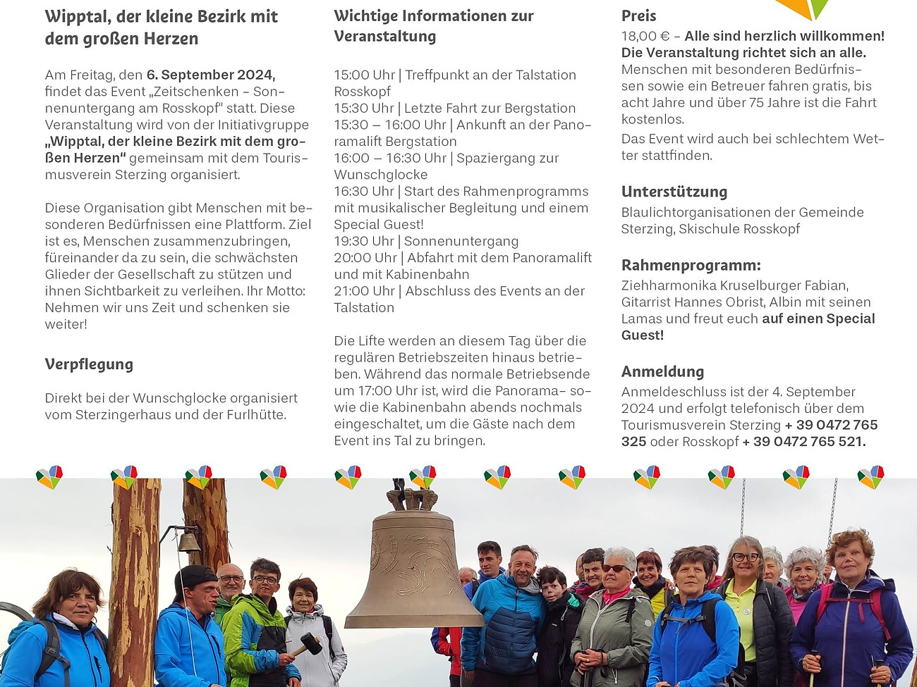 Am Freitag, den 6. September 2024, findet das Event „Zeitschenken - Sonnenuntergang am Rosskopf“ statt. Diese Veranstaltung wird vom „Wipptal, der kleine Bezirk mit dem großen Herzen“ gemeinsam mit der Tourismusgenossenschaft Sterzing organisiert.