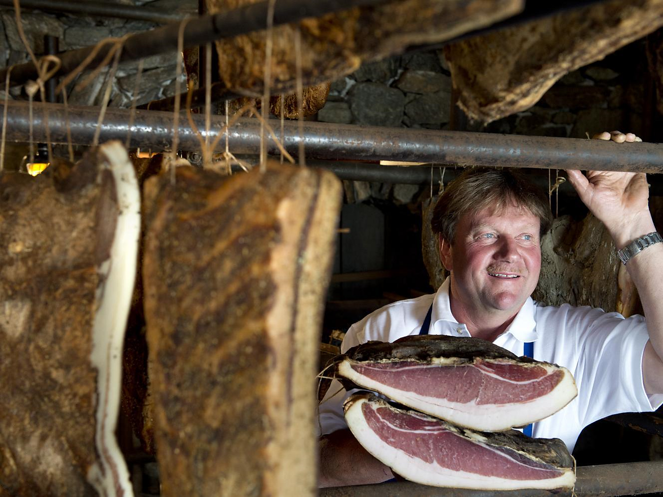 The following products are available to buy directly from the farm shop: speck (bacon), salami, smoked sausages, cooked herb-crusted ham, Coppa ham, farmer’s speck, seasonal fruit and vegetables, and in the autumn months chestnuts and pumpkins, apple juice and Vernatsch wine.