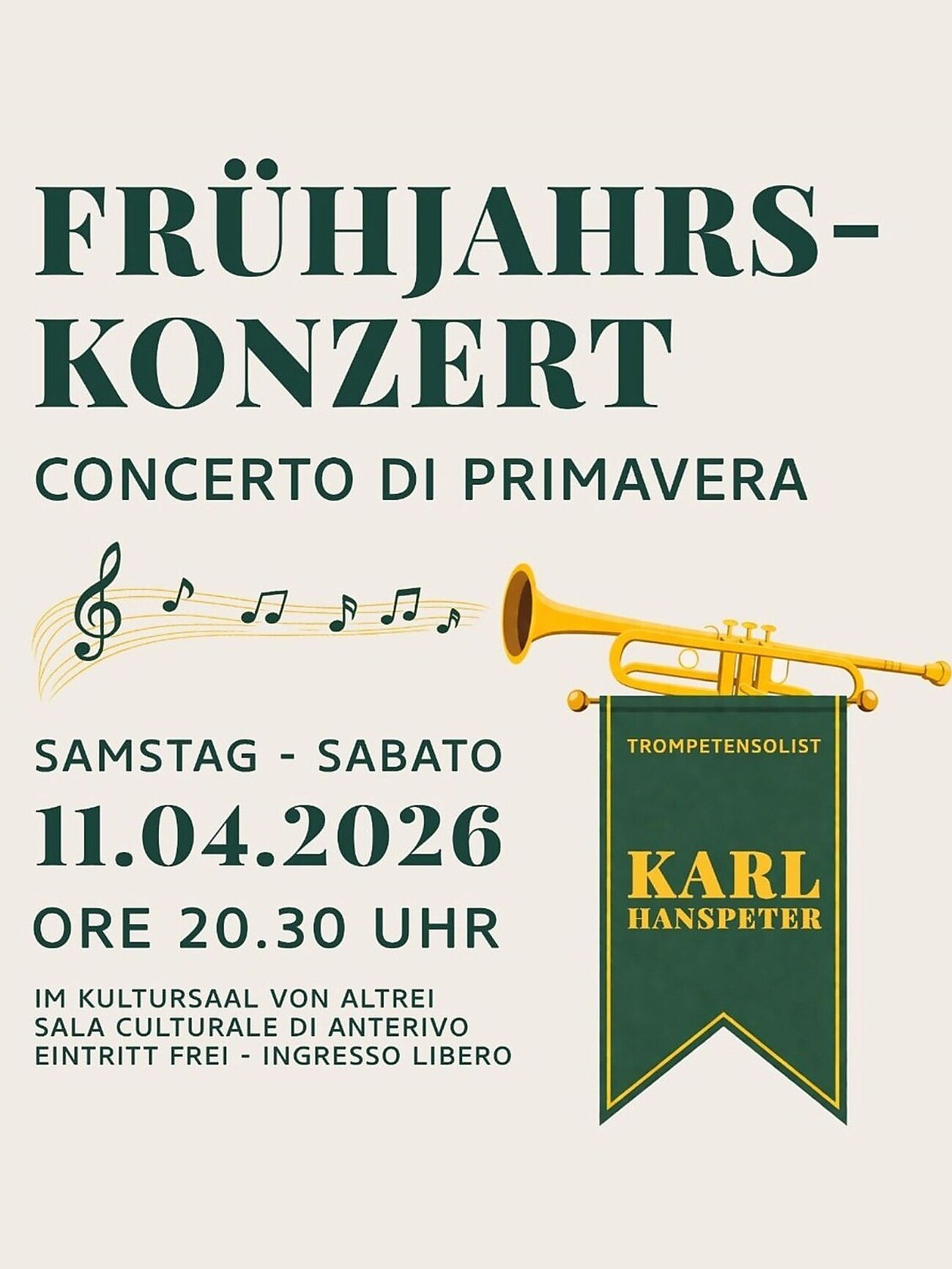 Musical entertainment by the Altrei music band on Saturday, April 11, 2026, at 8:30 PM in the cultural hall. Admission is free. Everyone is warmly invited.