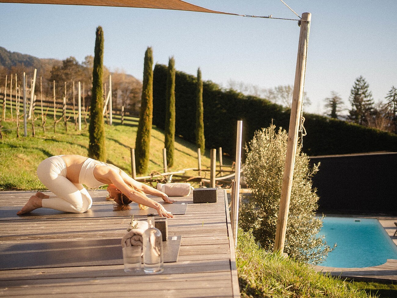 Rhythmic yoga movements in the evening light on the Roof Top Area....soft sounds, mountain water and some mountain spirituality will enrich you in this hour...