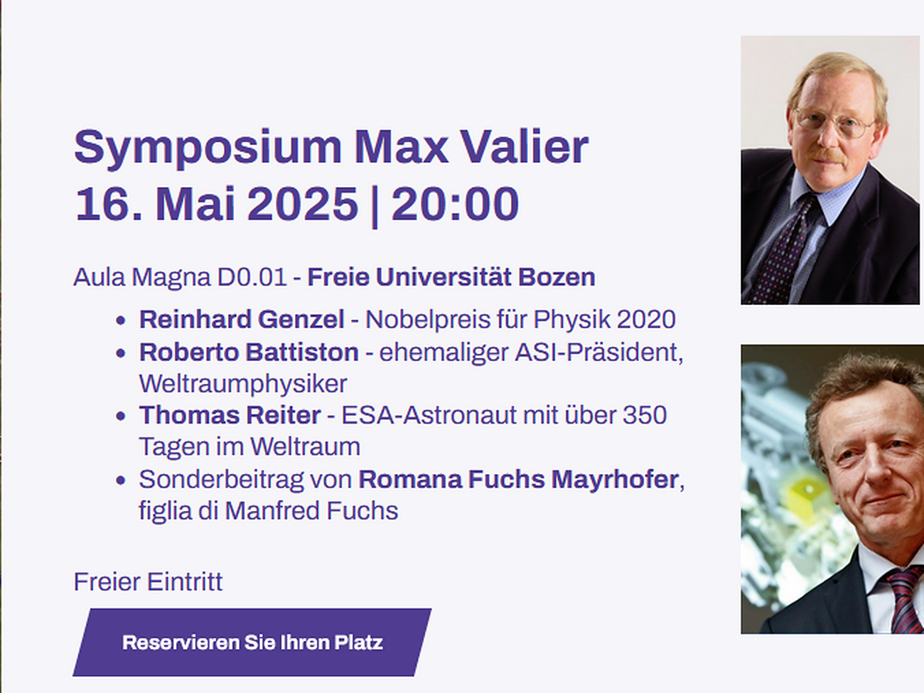 The Max Valier Symposium on May 16, 2025, will feature distinguished guests such as Reinhard Genzel, Nobel Prize winner in Physics 2020, Roberto Battiston, former ASI president and space physicist, Thomas Reiter, ESA astronaut with over 350 days in space, and a special contribution from Romana Fuchs Mayrhofer, daughter of Manfred Fuchs. The event is part of the Max Valier Weeks 2025, two weeks of public events dedicated to astronomy, rocketry, and space exploration, including lectures, exhibitions, films, astronomical observations, roundtable discussions, and meetings with scientists and astronauts. A unique opportunity to bring young people, families, enthusiasts, and curious minds closer to the fascination of space, on a journey through science, history, and the future. The event is organized by the MUA – Movimento Universitario Altoatesino in collaboration with the South Tyrol Museum of Nature, with the support of renowned partners in science, education, and media.