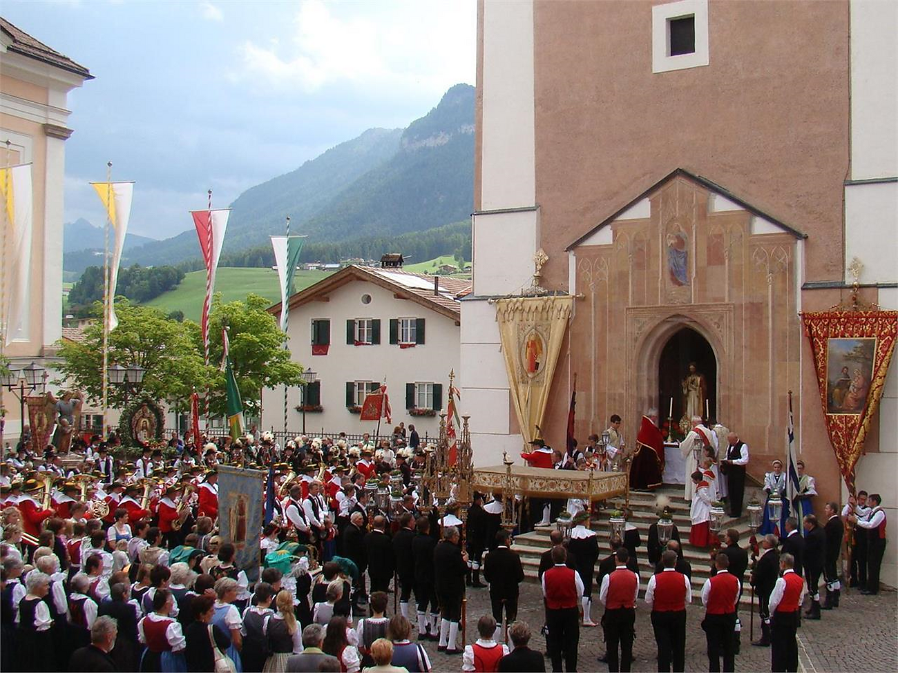 Thanksgiving Day in Kastelruth is an annual event where the people of the community express their gratitude for a successful harvest year. On the day of the celebration a Holy Mass is held, followed by a procession through the streets of the village. The procession starts at the church and goes through the streets of Kastelruth, while the villagers sing their harvest songs. At the end of the procession, the congregation gathers in the village square, where our local parish priest concludes the Mass and gives God's blessing to all those present.