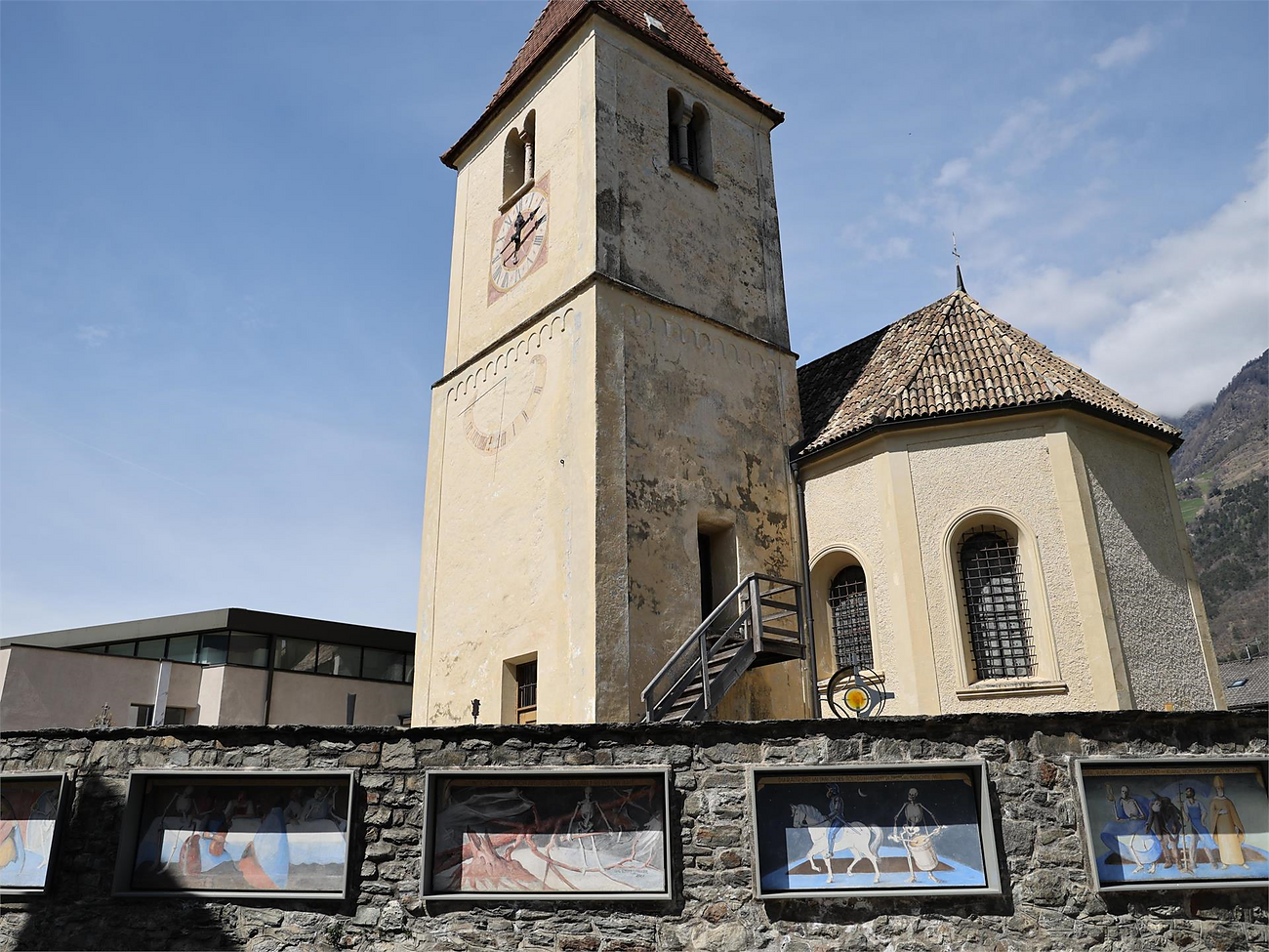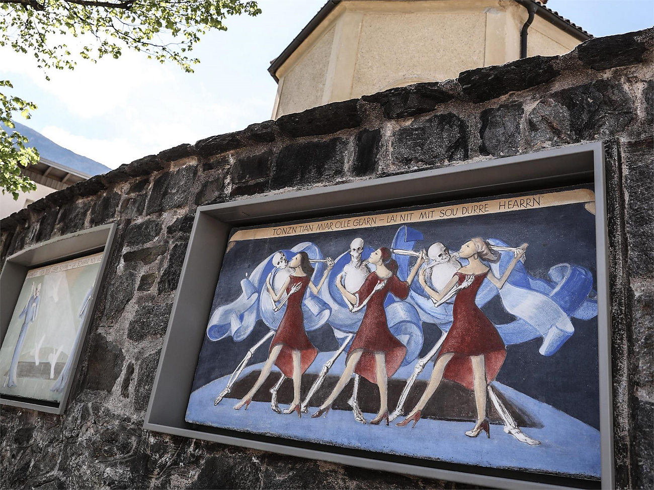 "Stop for a few moments, then maybe you know how to move on." This is one of 18 phrases on the "Plauser Totentanz" illustration cards on the wall of the Plaus cemetery painted by artist Luis Stefan Stecher.