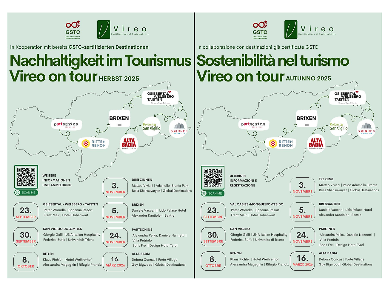 Mit der Veranstaltungsreihe „Nachhaltigkeit im Tourismus – Vireo on Tour“, von Vireo in Kooperation mit lokalen GSTC-zertifizierten Destinationen organisiert, informieren wir über den Zertifizierungsprozess, konkrete Maßnahmen und gute Praktiken.