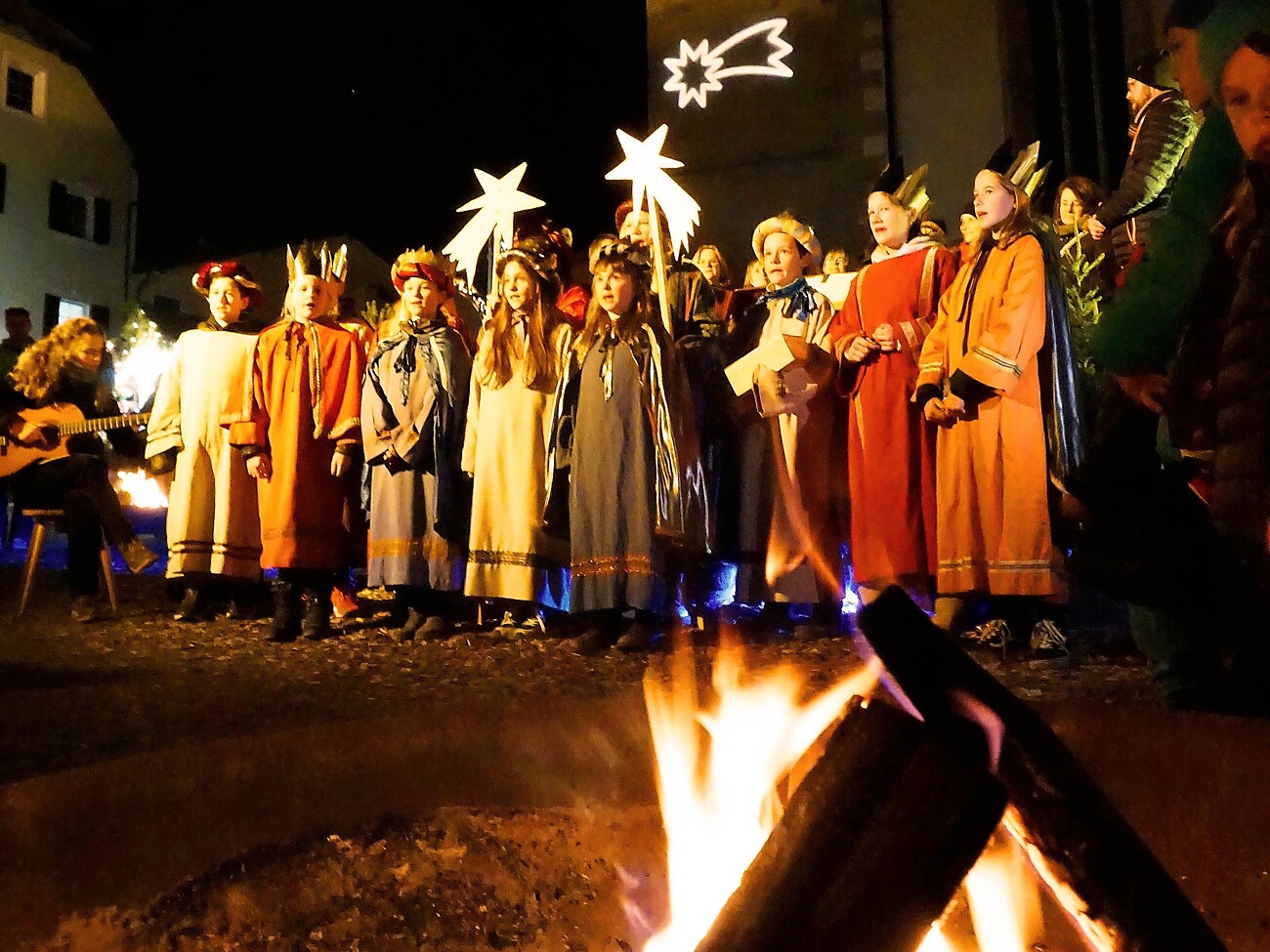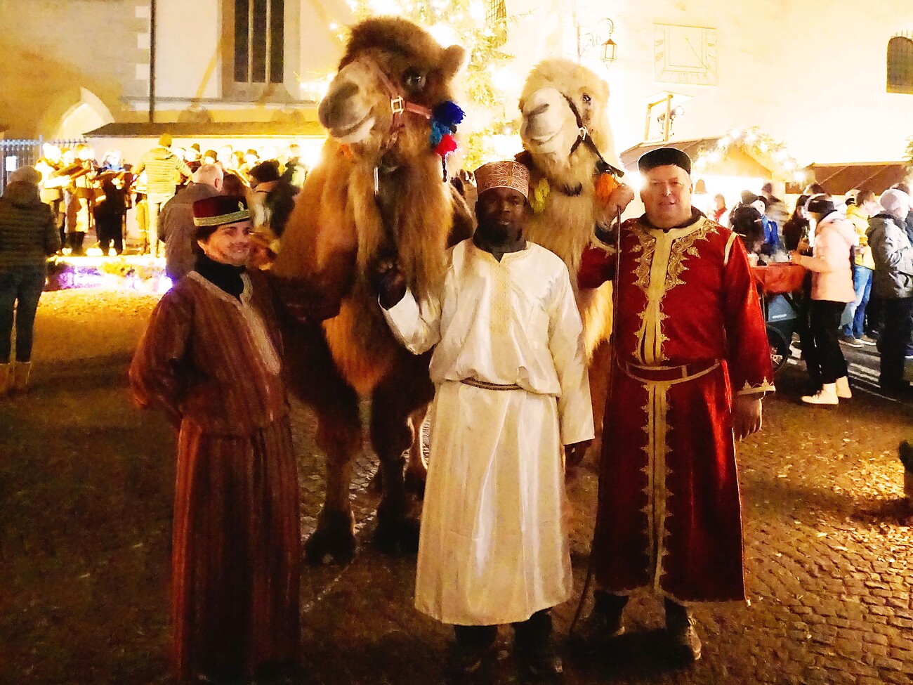 A special highlight of the Christmas market is the entry of the Three Holy Kings with real camels, framed and accompanied by the Völs church choir.