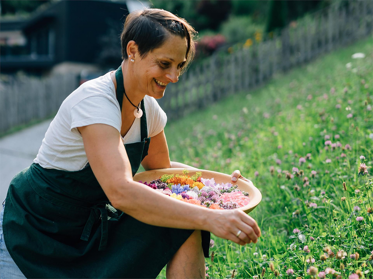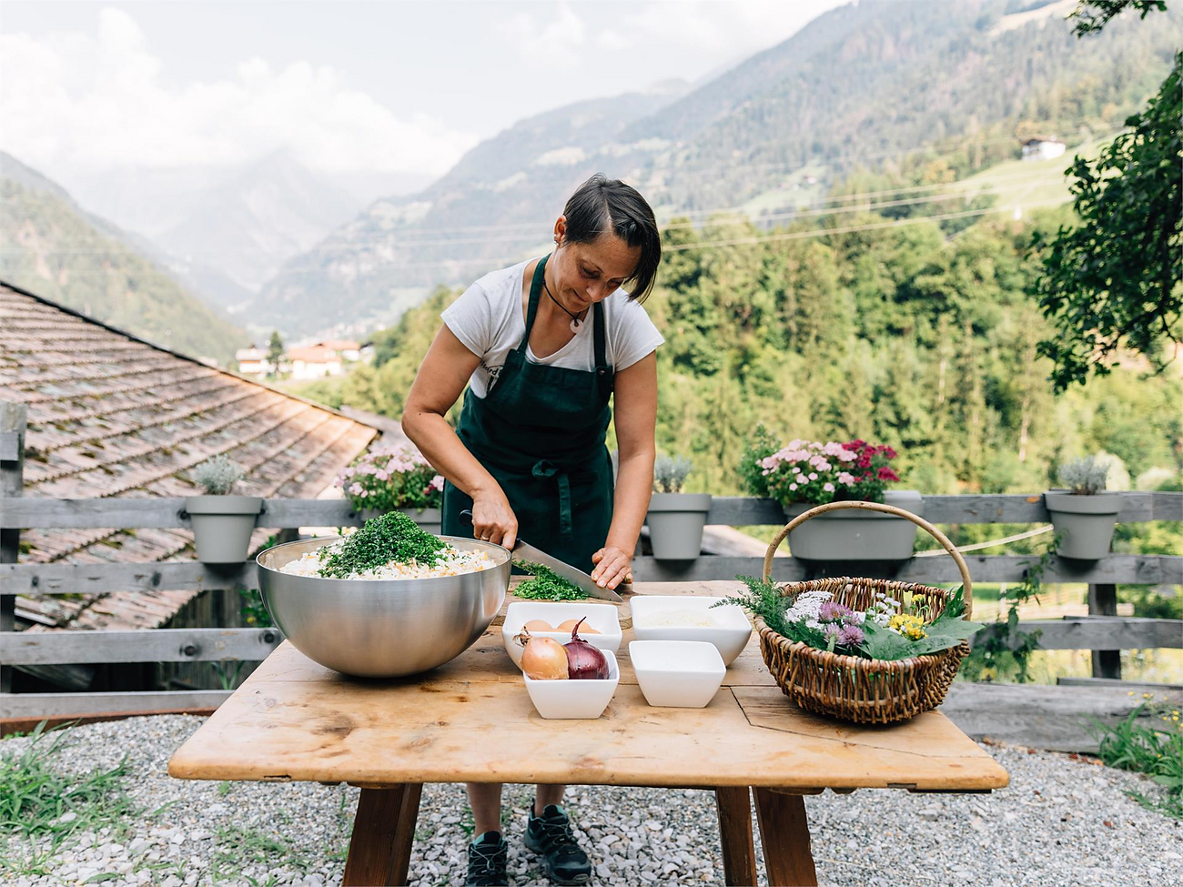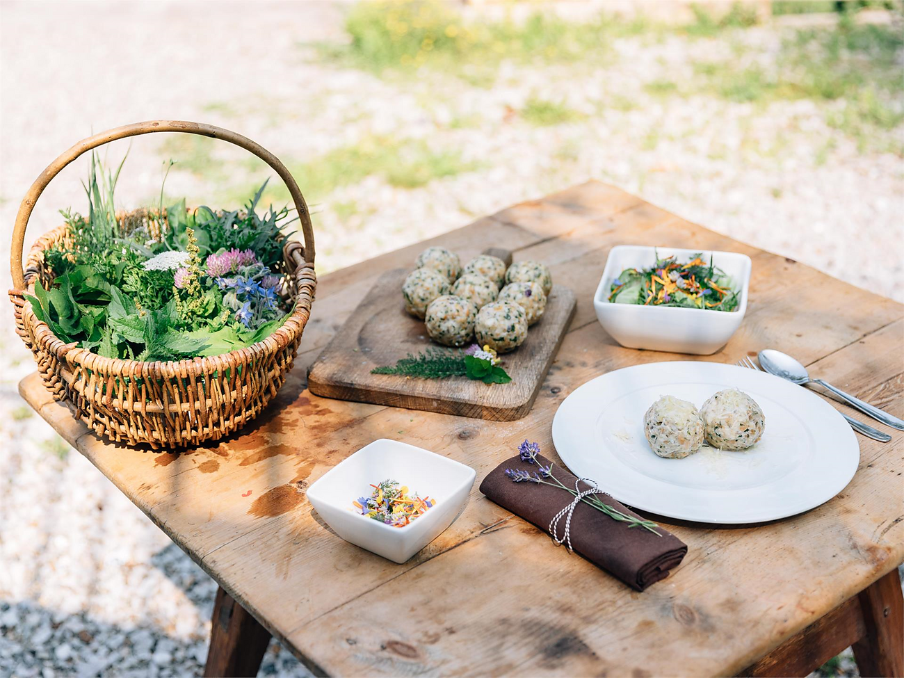Herbs and wild herbs are collected in the garden, which are then processed into a delicious lunch together with herbalist Rosi Mangger Walder.
