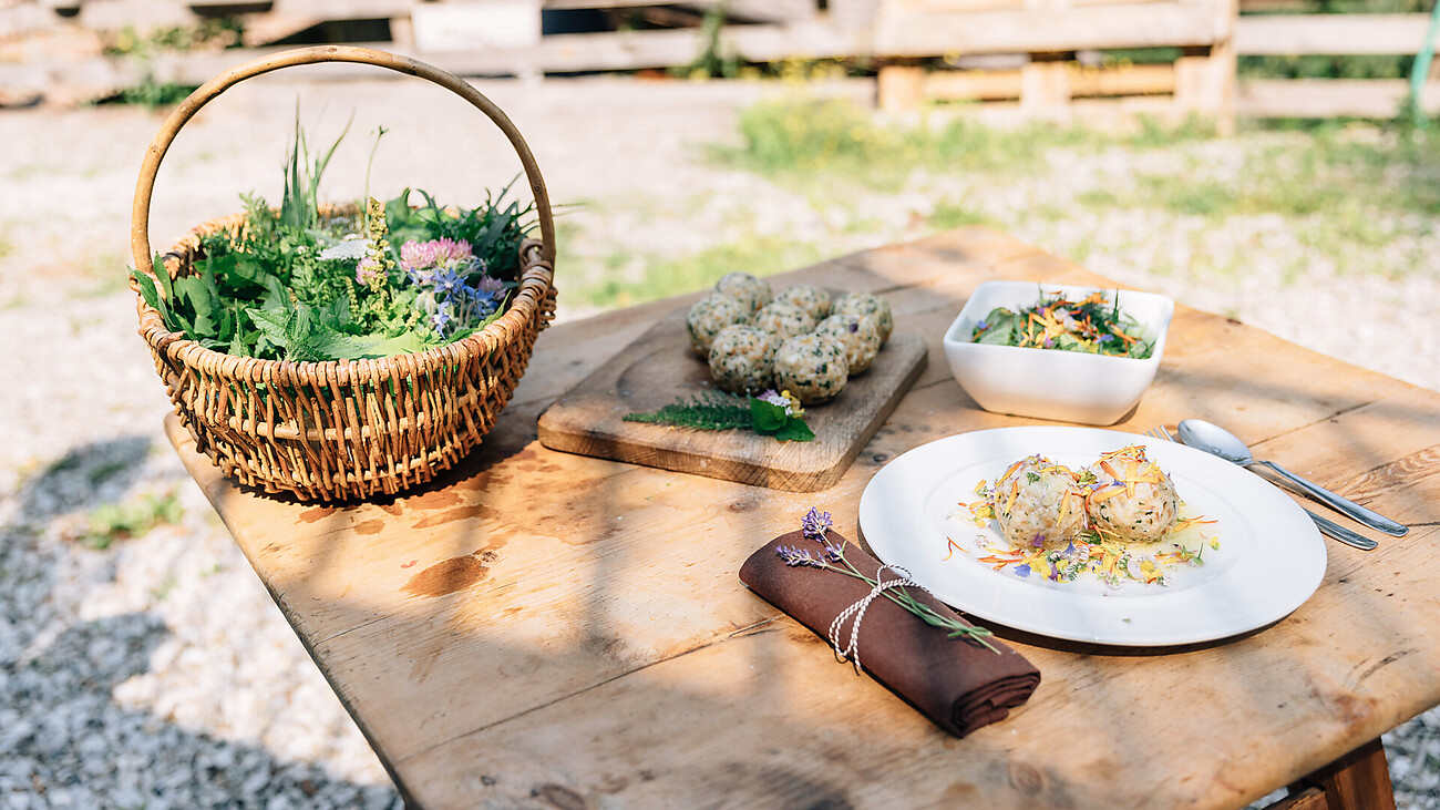 Herbs and wild herbs are collected in the garden, which are then processed into a delicious lunch together with herbalist Rosi Mangger Walder.