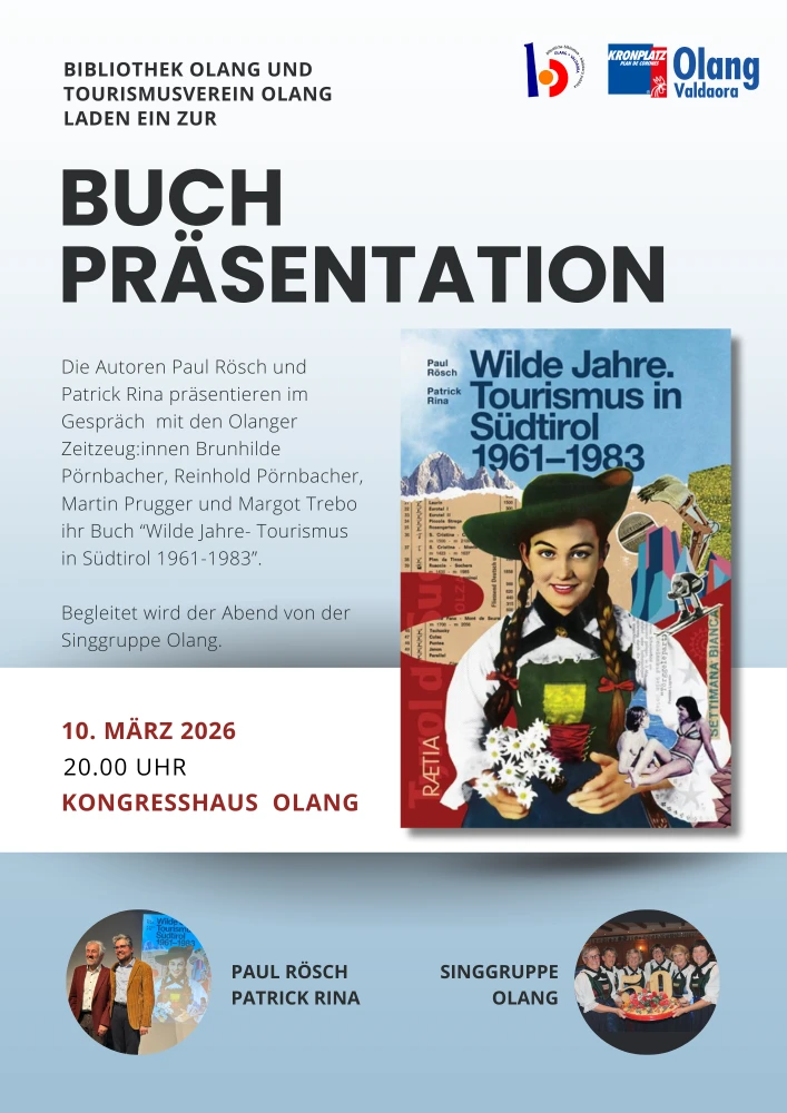 Die Autoren Paul Rösch und Patrick Rina präsentieren im Gespräch mit den Olanger Zeitzeug:innen Brunhilde Pörnbacher, Margot Trebo, Reinhold Pörnbacher und Martin Prugger ihr Buch "Wilde Jahre. Tourismus in Südtirol 1961-1983".