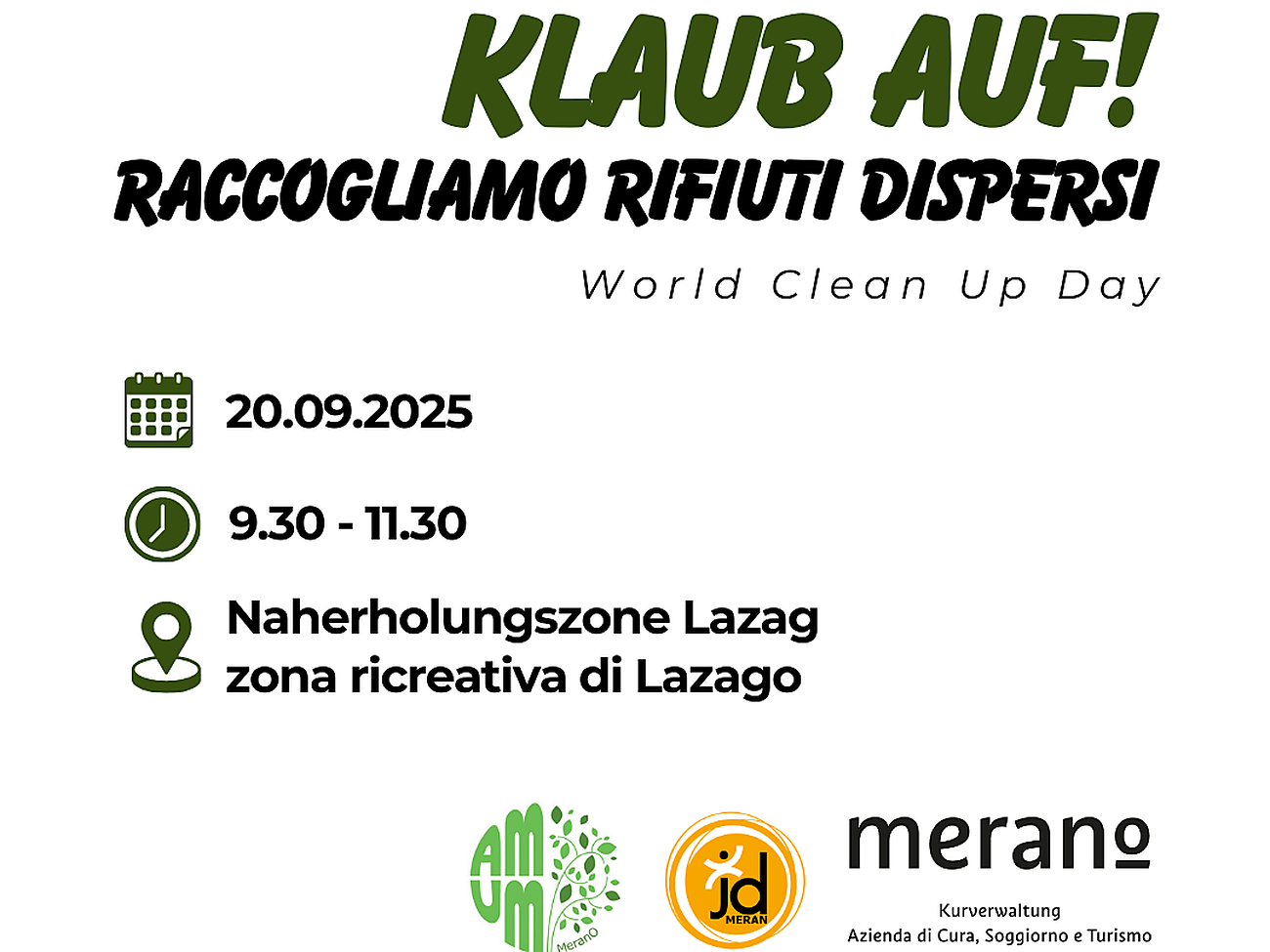 AmUm Ambiente Umwelt MeranO ODV organisiert anlässlich des World CleanUp Day am Samstag, den 20. September 2025, eine Müllsammelaktion von 9:30 bis 11:30 Uhr in der Naherholungszone Lazag. Die Veranstaltung wird in Zusammenarbeit mit dem Jugenddienst und der Kurverwaltung Meran durchgeführt.