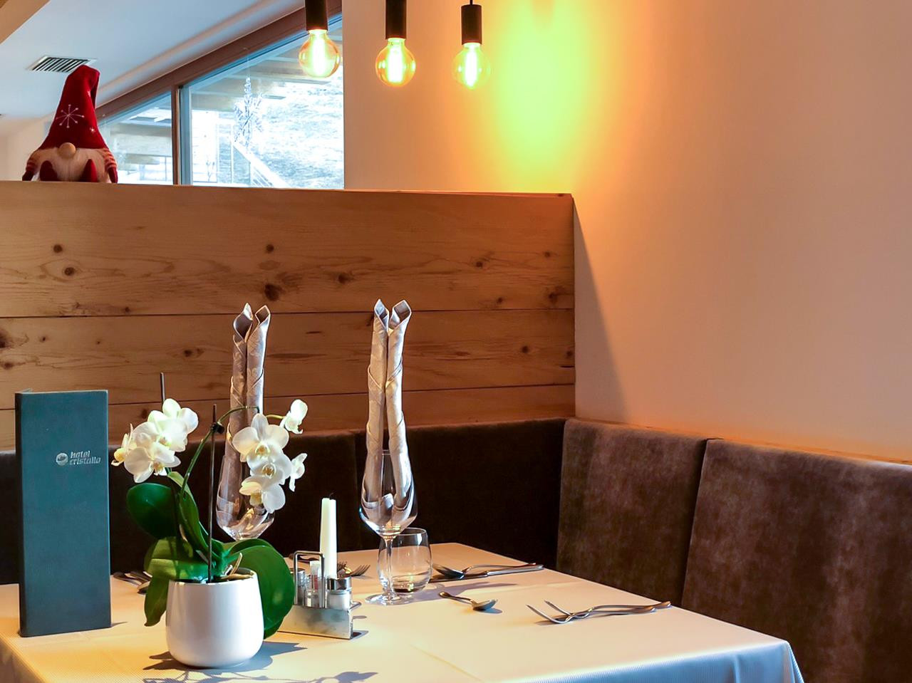 With this philosophy our restaurant is born, whose aim is to use local and alpine wealth presenting game and selected meats dishes and other delicacies wisely matched together with our tastes of the woods. Our Chef gives a high value to product quality, wisely matched together to charm even the hardest to please palates. He enhances the flavours of the memory using for his homemade paste just kamut or carob wheat and aromatic herbs and transforming them in today flavours with creative compositions of high gastronomy