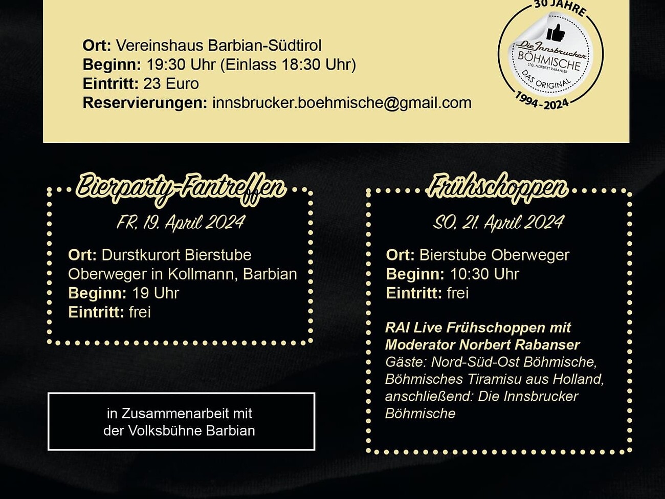 30 anni - "Die Innsbrucker Böhmische" - RAI Südtirol live mattutino con Norbert Rabanser a Colma presso "Bierstube Oberweger" con inizio alle ore 10:30. Entrat libera.